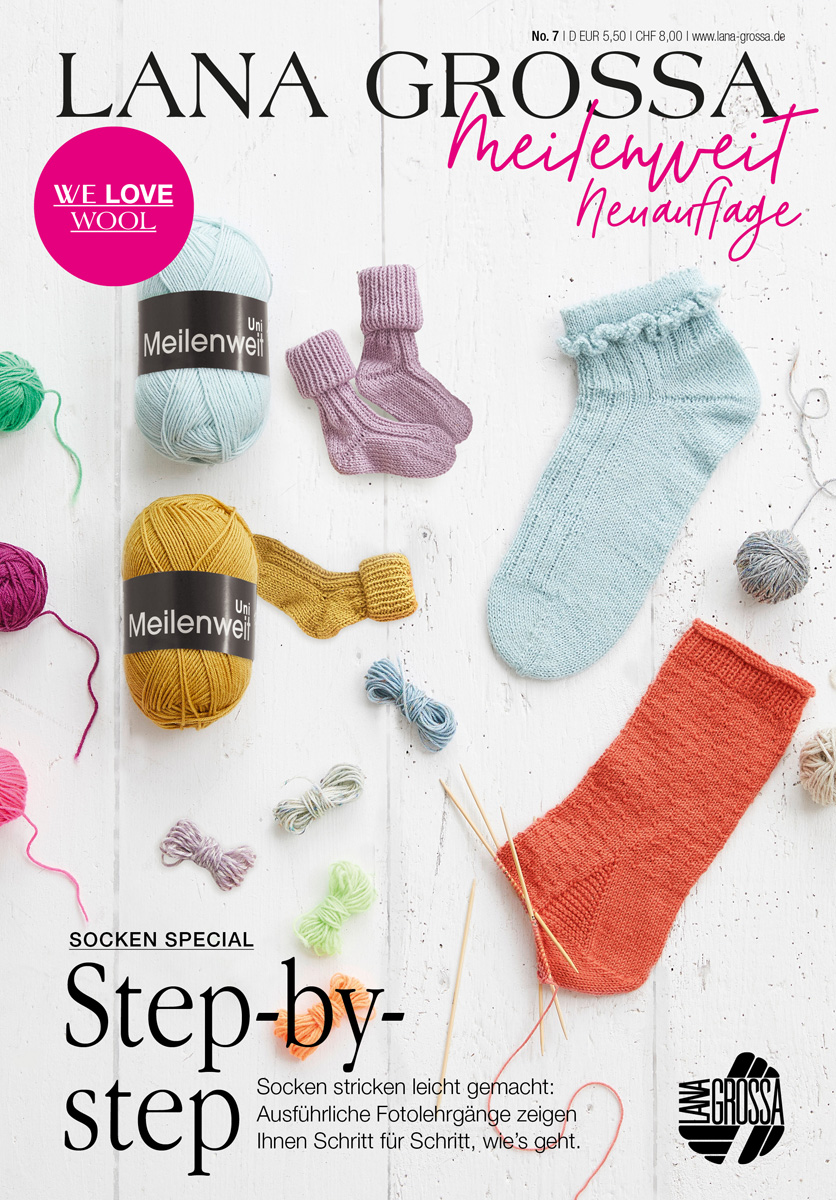 I LOVE SOCKS It’s hard to believe: I knitted my first socks 25 years ago. I could never resist my fascination for sophisticated patterns, clever techniques and novelty yarns. Of course, I always have Meilenweit yarn nearby, because the best ideas for new designs can come out of the blue. Knitting socks are not as difficult as people say. This is evident in the following pages! Here we have uncomplicated exclusive designs from Kerstin Balke, Kristin Joél, as well as me, knitted from the cuff to the toes. Step by step illustrated instructions will easily get you started. We even include a handy sizing table!Are you already familiar with the increase heel? It was new to me and thanks to Barbara Angilowski with her step-by-step instructions you will get it too, I promise! This all inclusive program will spark a passion for sock knitting. Trust me: the sight of a well-stocked knitted sock drawer will make you happy and proud! Yours Tanja Steinbach Design-Team