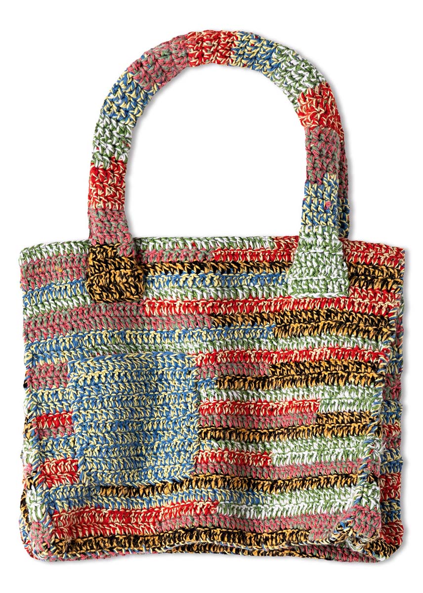 100 g each of Lana Grossa Solo Lino (80% recycled linen [viscose], 20% linen; 120 m/50 g) in Black (col 14), Flamingo Pink (col 67), Vanilla (col 69), Green (col 74) and Yellow (col 73); 50 g each of Lana Grossa Ecopuno (72% cotton, 17% Merino wool, 11% baby alpaca; 215 m/50 g) in Saffron (col 216), Reseda Green (col 20), Red (col 100), White (col 26) and Gentian Blue (col 213). Size 3 mm crochet hook.
