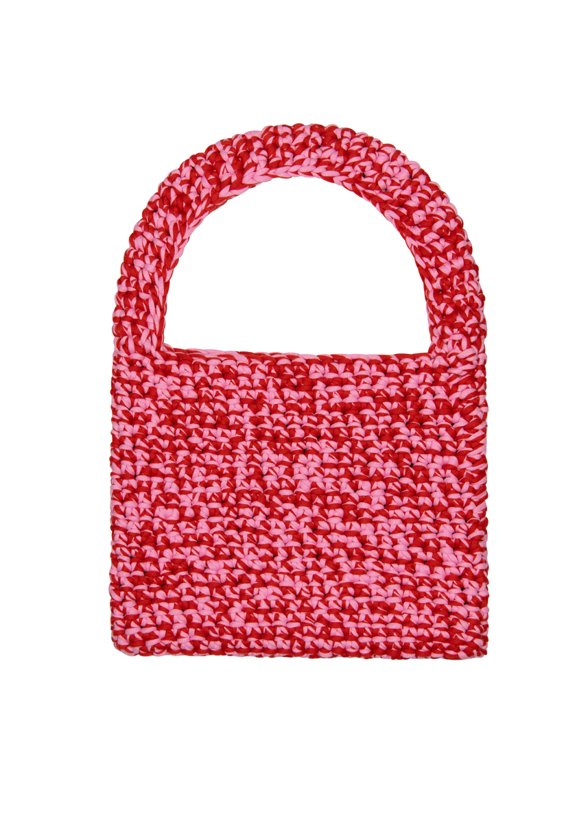 400 g each of Lana Grossa The Tube (60% cotton, 40% nylon; 114 m/200 g) in Red (col 7) and Rose (col 19). Size 8 mm crochet hook.