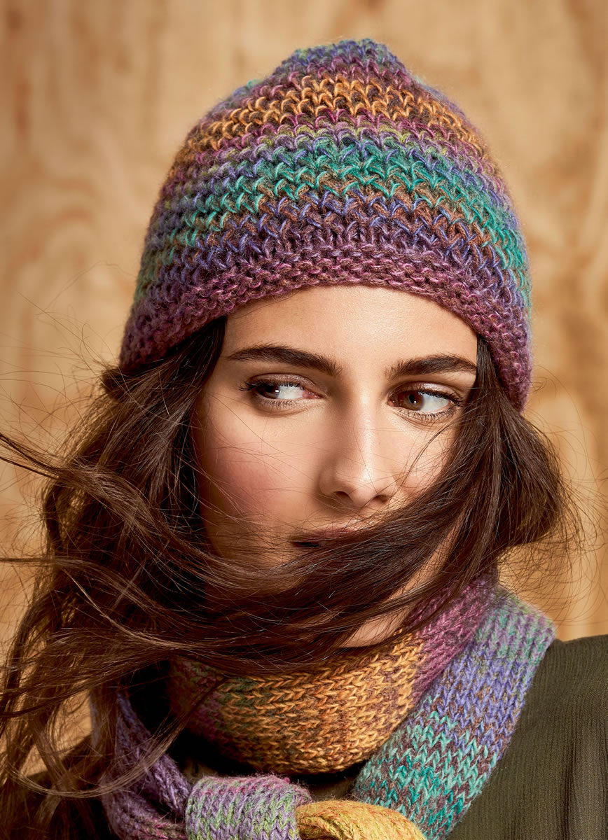 100 g of Lana Grossa Lace Seta Degradè (70% baby alpaca, 30% silk; 500 m/100 g) in Jade/Gold/Heather/Lavender (col 110) and 50 g of Lana Grossa Cashmere 16 Fine Degradè (80% extrafine Merino wool, 10% cashmere, 10% polyamide; 320 m/50 g) in Mustard/Rust/Gentian Blue/Turquoise/Blue-Violet (col 104). Size 6 mm needles