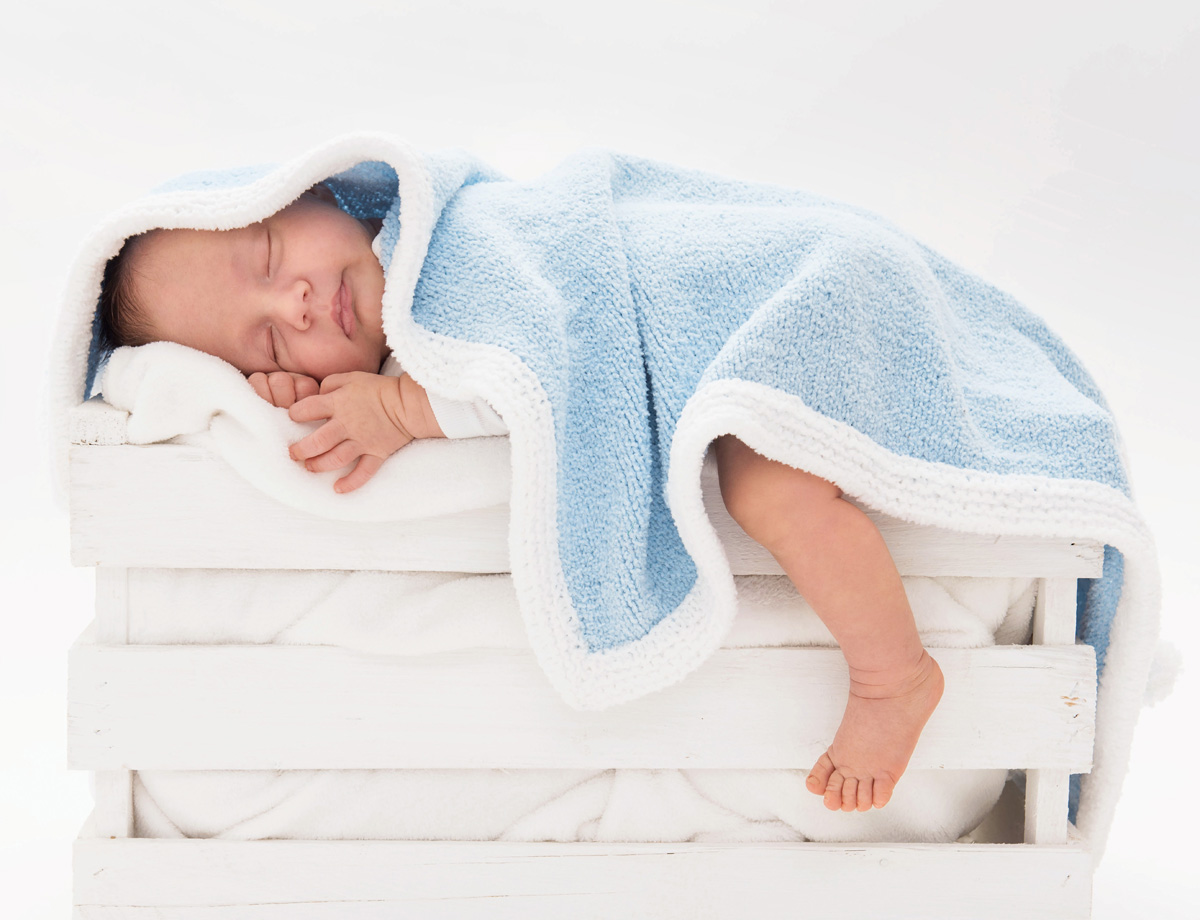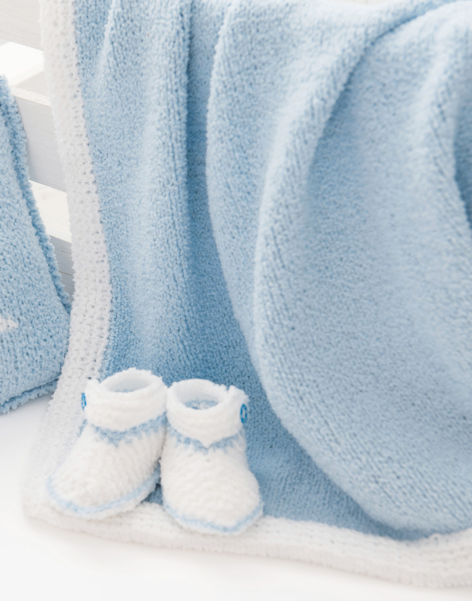 200 g of Lana Grossa Baby Soft (60% polyamide, 40% cotton; 150 m/50 g) in Light Blue (col 8) and 50 g in White (col 1). Size 4 mm needles; size 4 mm circular needle, 120 cm long; pompom maker