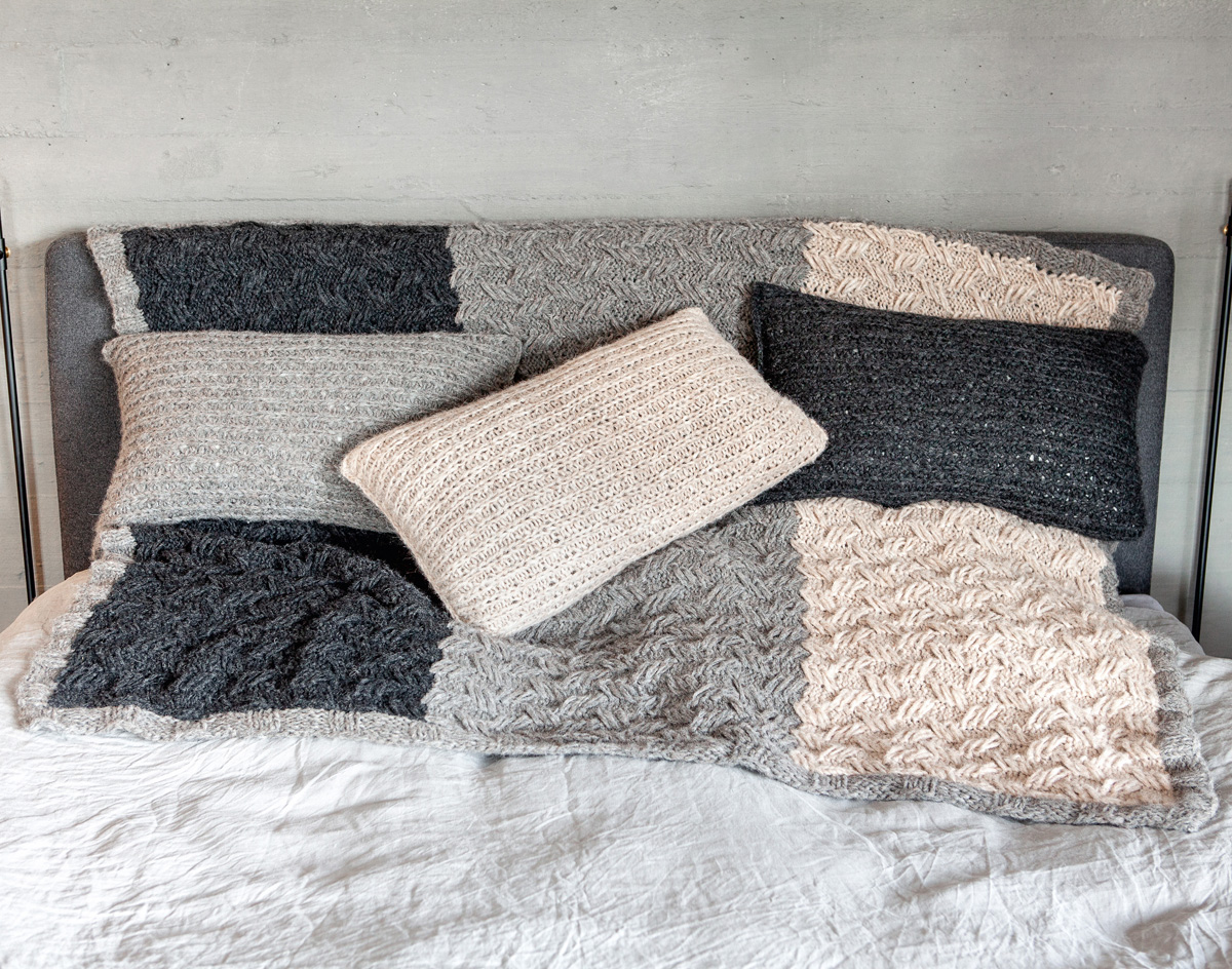 300 g each of Lana Grossa Cloud (80% alpaca, 14% Merino wool, 6% polyamide; 80 m/50 g) in Charcoal (col 13) and Beige (col 2) and 350 g in Taupe (col 22). Size 6 and 6.5 mm circular needles, each 120 cm long; cable needle [cn]