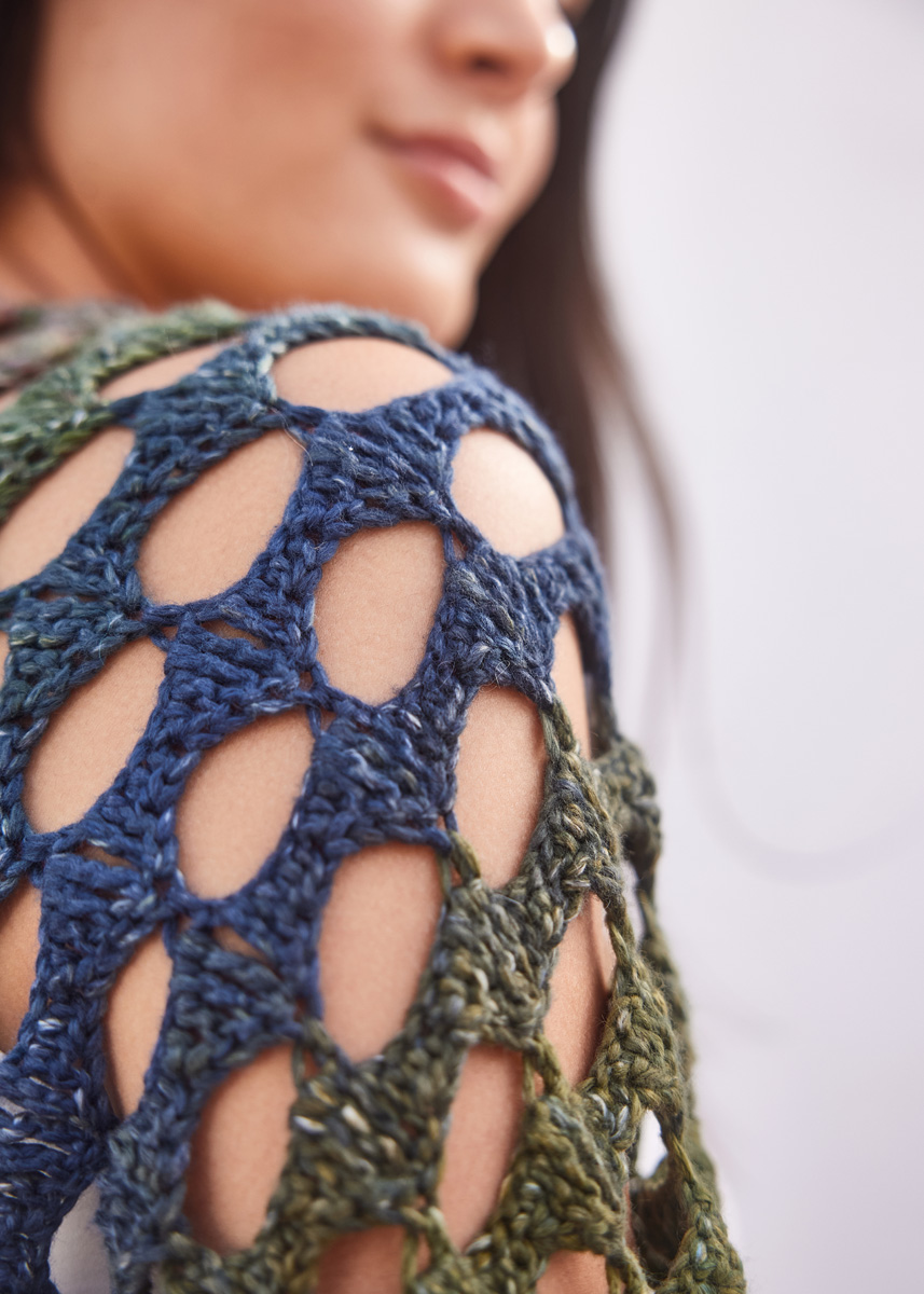 300 (300, 400, 400) g of Lana Grossa Cotonella (100% Pima cotton; 280 m/100 g) in Moss Green/Blue Green/ Black Green/Olive/Red Violet/Blue Violet/Sea Green (col 8). Size 3.5 mm crochet hook