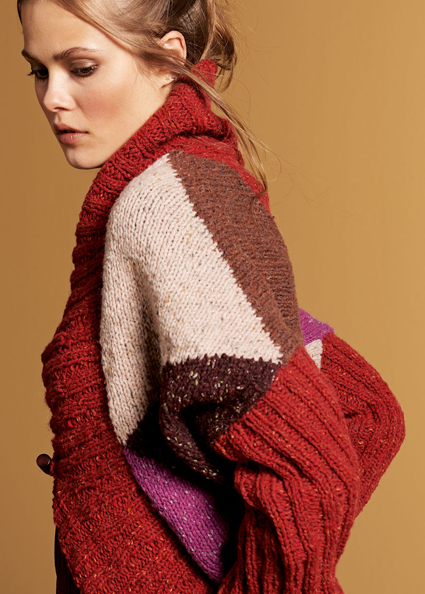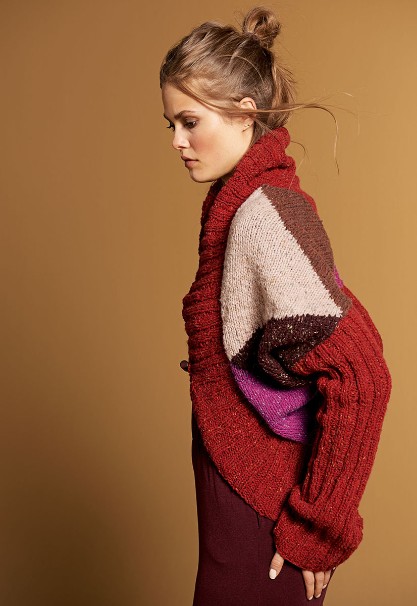 300 g of Lana Grossa Royal Tweed (100% pure wool; 100 m/50 g) in Heathered Brick (col 21) and 50 g each in Heathered Cinnamon (col 78), Heathered Beige-Pink (col 81), Heathered Burgundy (col 71) and Heathered Cyclamen (col 79). Size 6 mm needles; size 5.5 and 6 mm circular needles, each 100 cm long; one set each size 5.5 and 6 mm double-pointed needles [dpns]; size 4.5 mm crochet hook; one 50 mm button [by UNION KNOPF, item 452 069, col 48].