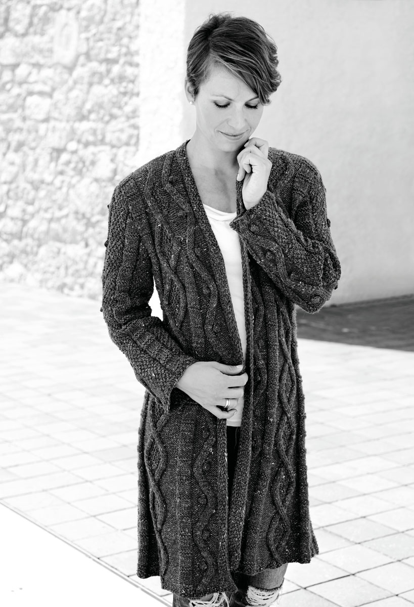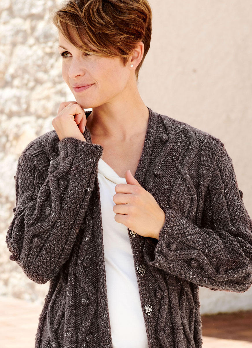 950 (1000, 1050) g of Lana Grossa Slow Wool Canapa (90% pure wool, 10% hemp; 100 m/50 g) in Grey/Brown (col 14). Size 4.5 mm needles; size 4.5 mm circular needle, 120 cm long; cable needle [cn]; three 22 mm snap buttons [by Union Knopf, item 500720, col 83