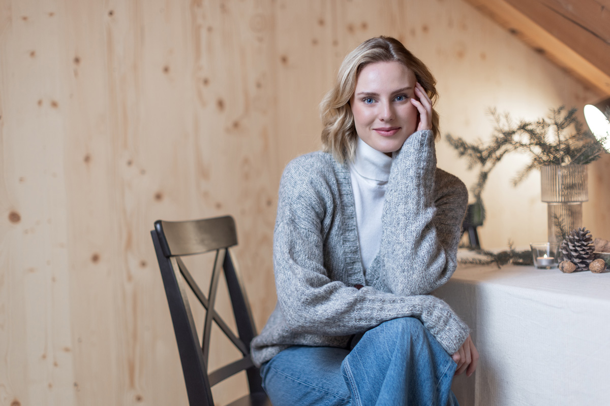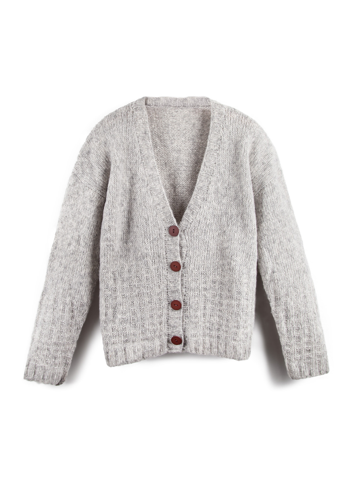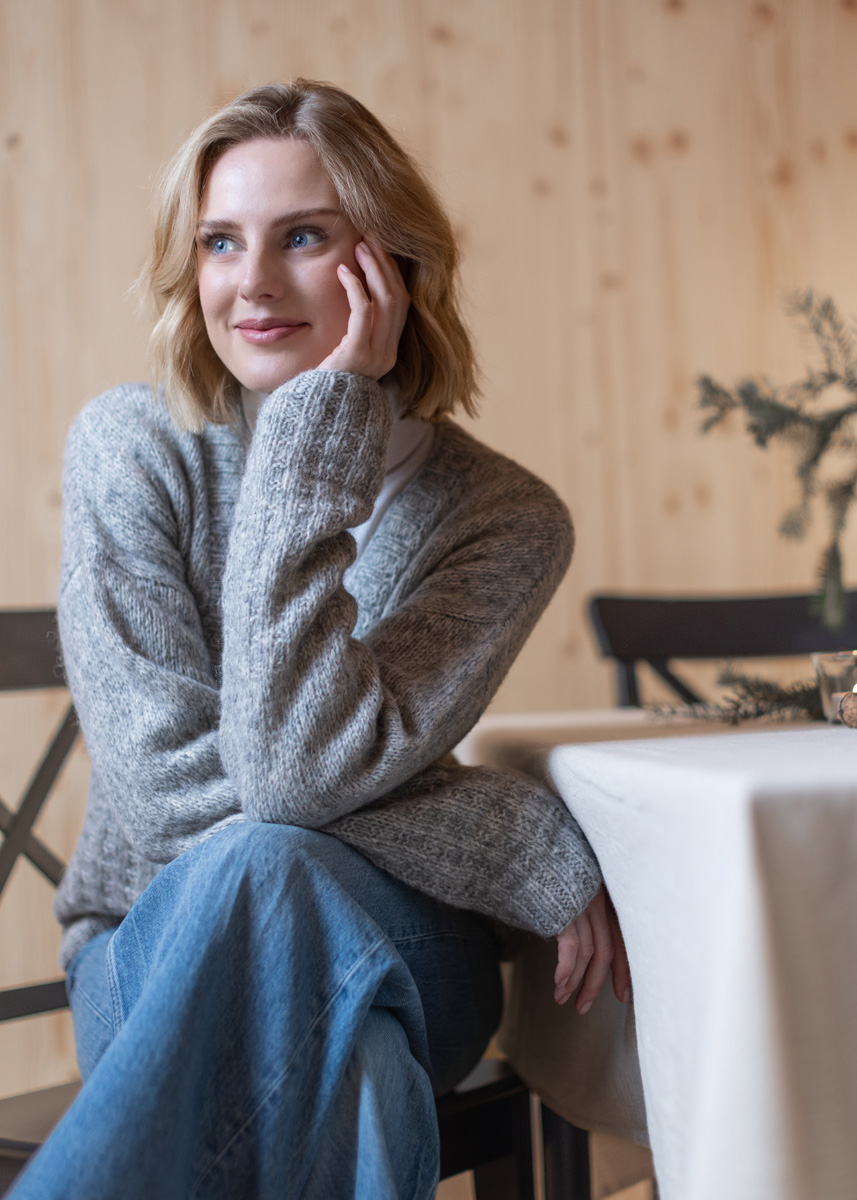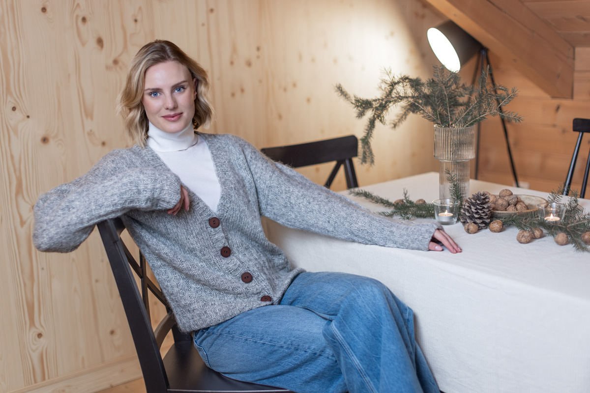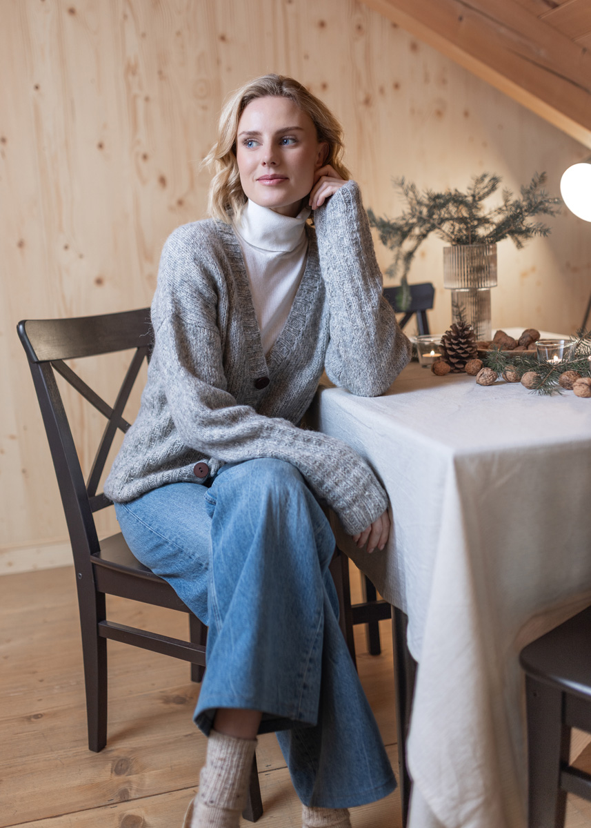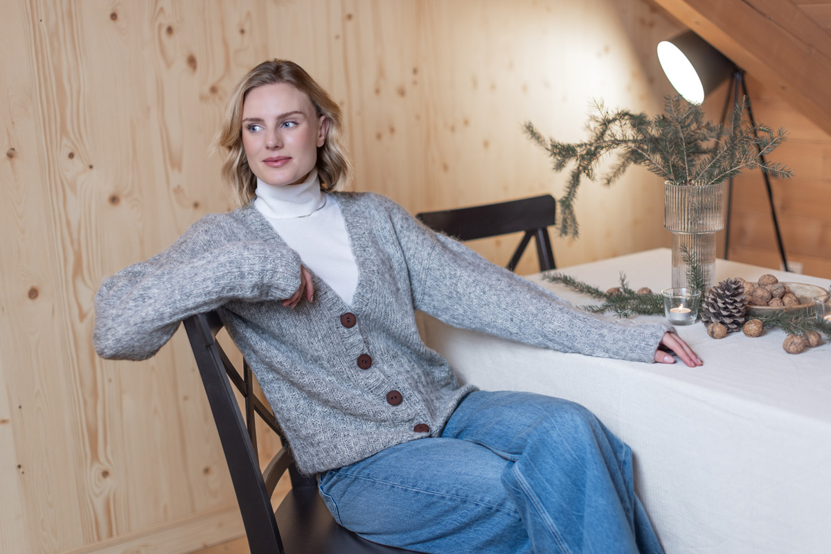 The cardigan has a total length of 58 (60 - 62 - 64 - 66 - 68) cm and a positive ease of 10 cm at 80 cm bust circumference (12 cm at 88 cm bust circumference - 10 cm at 96 cm bust circumference - 10 cm at 104 cm bust circumference - 4 cm at 116 cm bust circumference - 2 cm at 128 cm bust circumference).