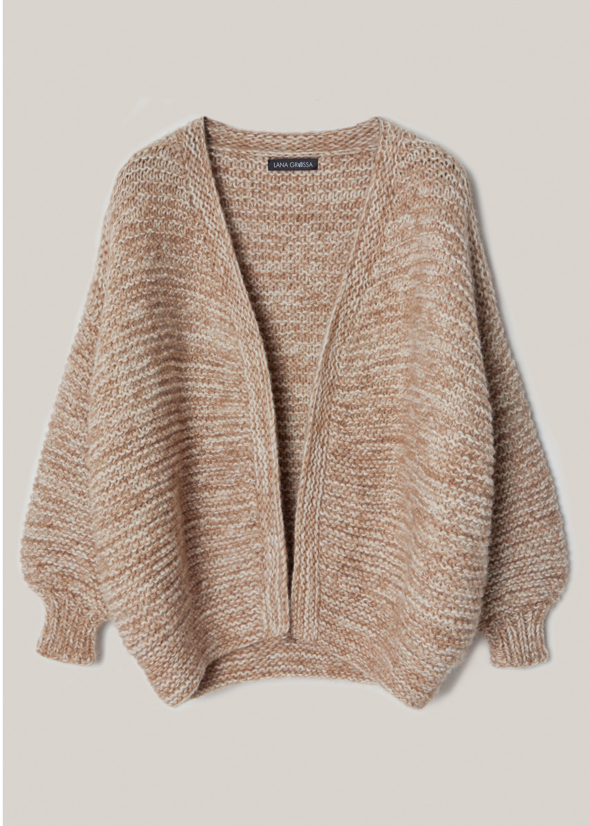 350 (400) g each of Lana Grossa Natural Alpaca Pelo (63% cotton, 31% baby alpaca, 6% Merino wool; 125 m/50 g) in Camel/Beige (col 7) and Off White/Pale Beige (col 5). Size 7 mm circular needles, 40, 80 and 100 cm long; size 6 mm circular needle, 120 cm long; one set size 6 mm dpns.