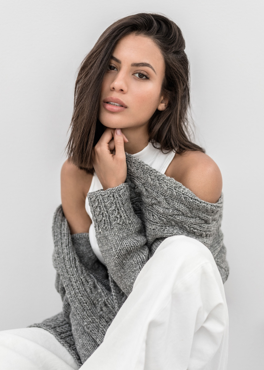 600 (650, 700, 750) g of Lana Grossa Alta Moda Alpaca (90% baby alpaca, 5% Merino wool, 5% polyamide; 140 m/50 g) in Light Grey Mélange (col 12). Size 6 and 6.5 mm needles; cable needle [cn]