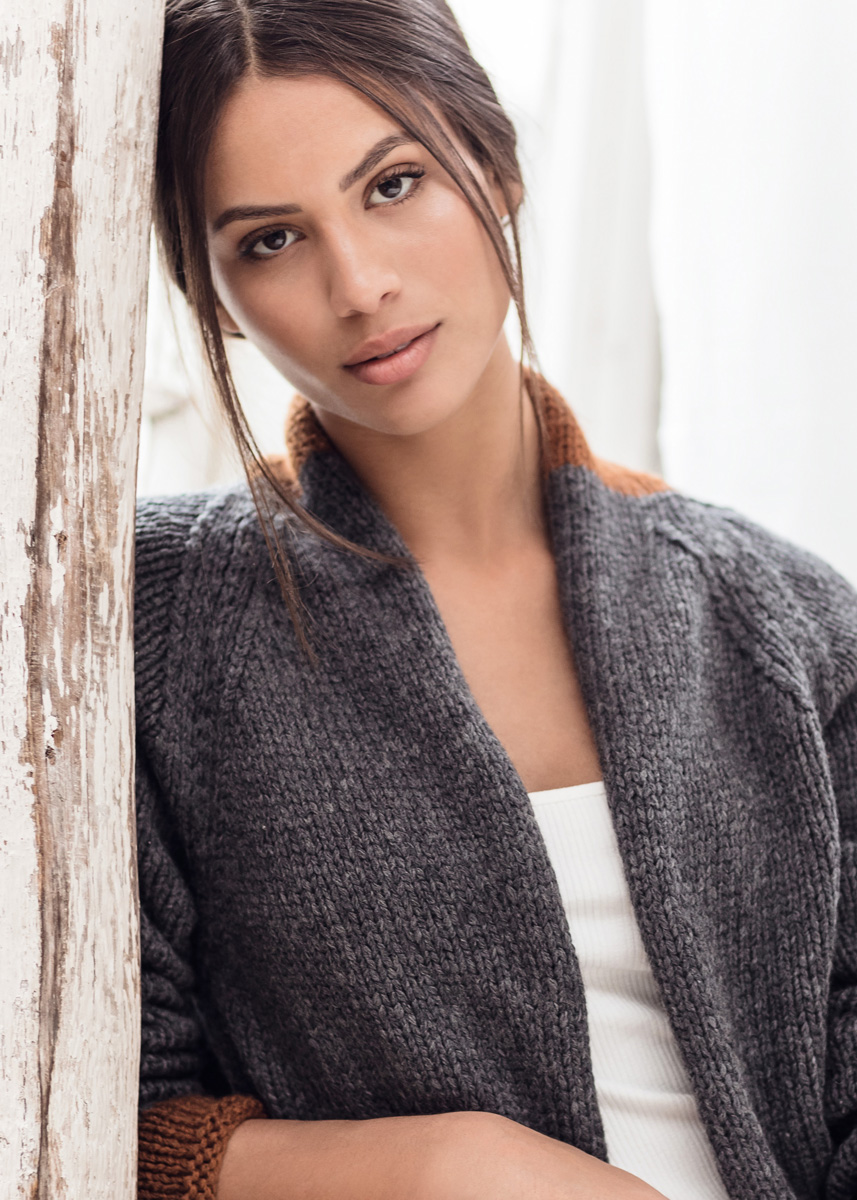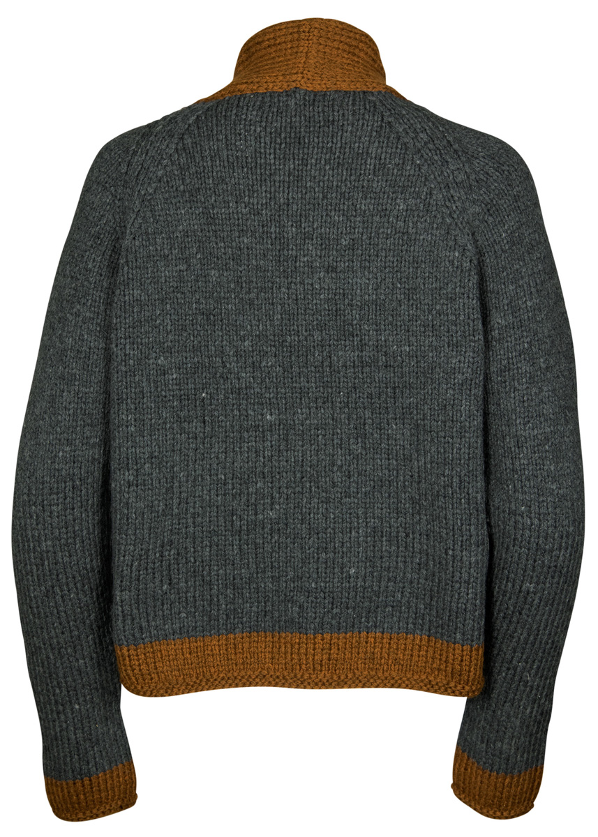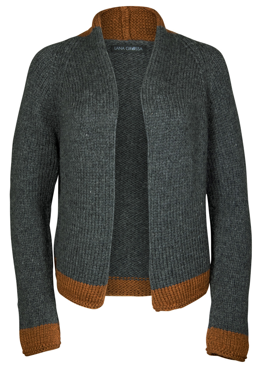 400 (400, 450) g of Lana Grossa Alta Moda Cashmere 16 (78% Merino wool, 12% cashmere, 10% polyamide; 110 m/50 g) in Grey (col 13) and 100 g in Brown (col 42). Size 6.5 and 7 mm needles
