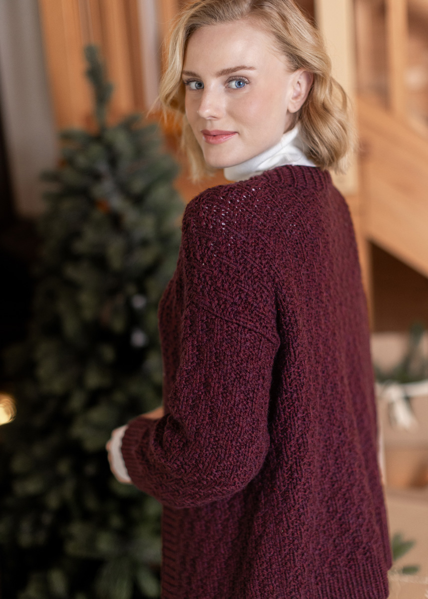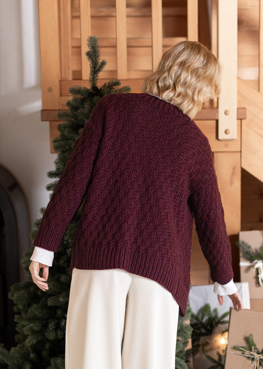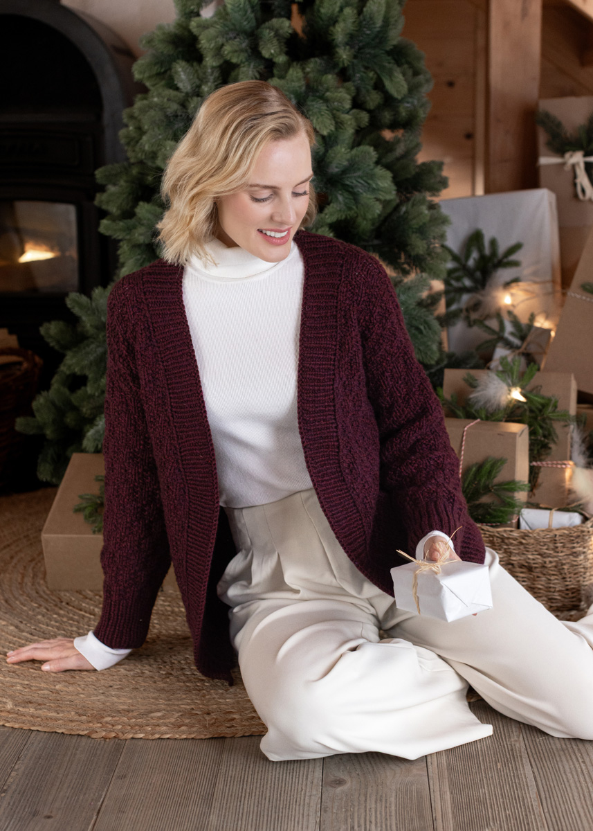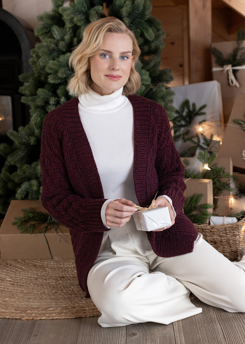 The cardigan has a total length of 57 (59 - 61 - 63 - 65 - 67) cm and a positive ease of 20 cm at 80 cm bust circumference (18 cm at 88 cm bust circumference - 16 cm at 96 cm bust circumference - 14 cm at 104 cm bust circumference - 14 cm at 116 cm bust circumference - 14 cm at 128 cm bust circumference).