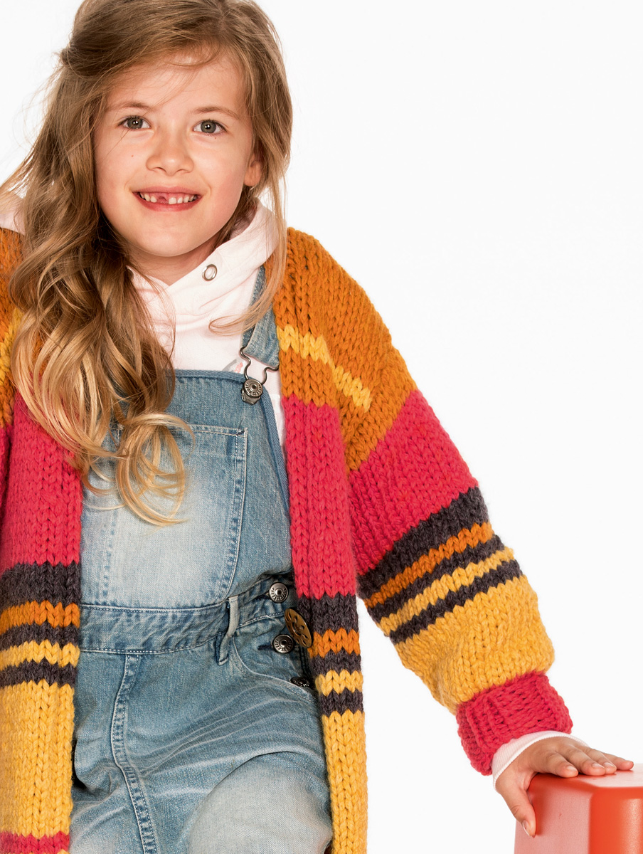 200 (250) g each of Lana Grossa Alta Moda Superbaby (67% Merino wool, 30% baby alpaca, 3% polyamide; 60 m/50 g) in Coral (col 51) and Yellow, 150 g in Orange (col 42) and 100 g in Charcoal (col 6). Size 10 mm needles; size 7 mm crochet hook; 2 stitch markers; one 36 mm decorative button