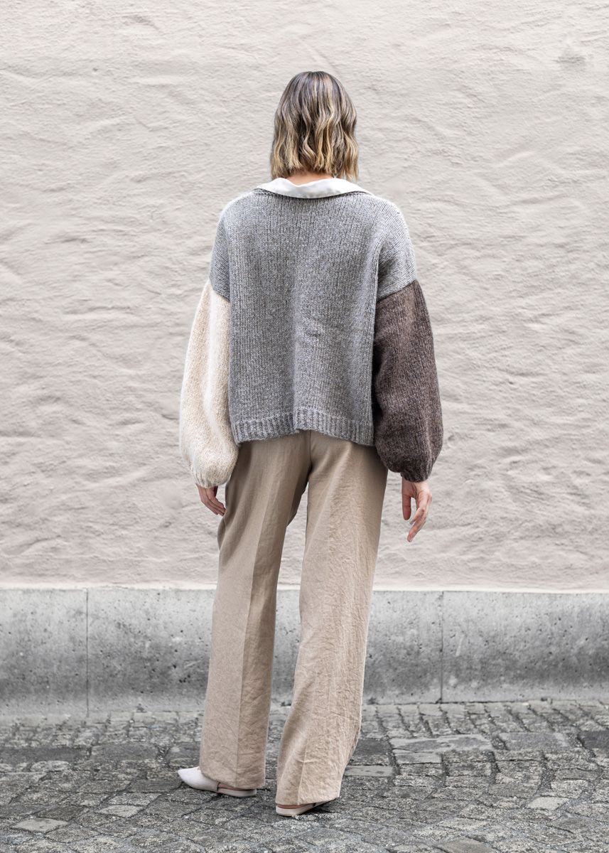 The cardigan has a total length of 50 (52 - 54 - 56 - 58 - 60) cm and a positive ease of 32 cm at 80 cm bust circumference (32 cm at 88 cm bust circumference - 28 cm at 96 cm bust circumference - 28 cm at 104 cm bust circumference - 24 cm at 116 cm bust circumference - 20 cm at 128 cm bust circumference).