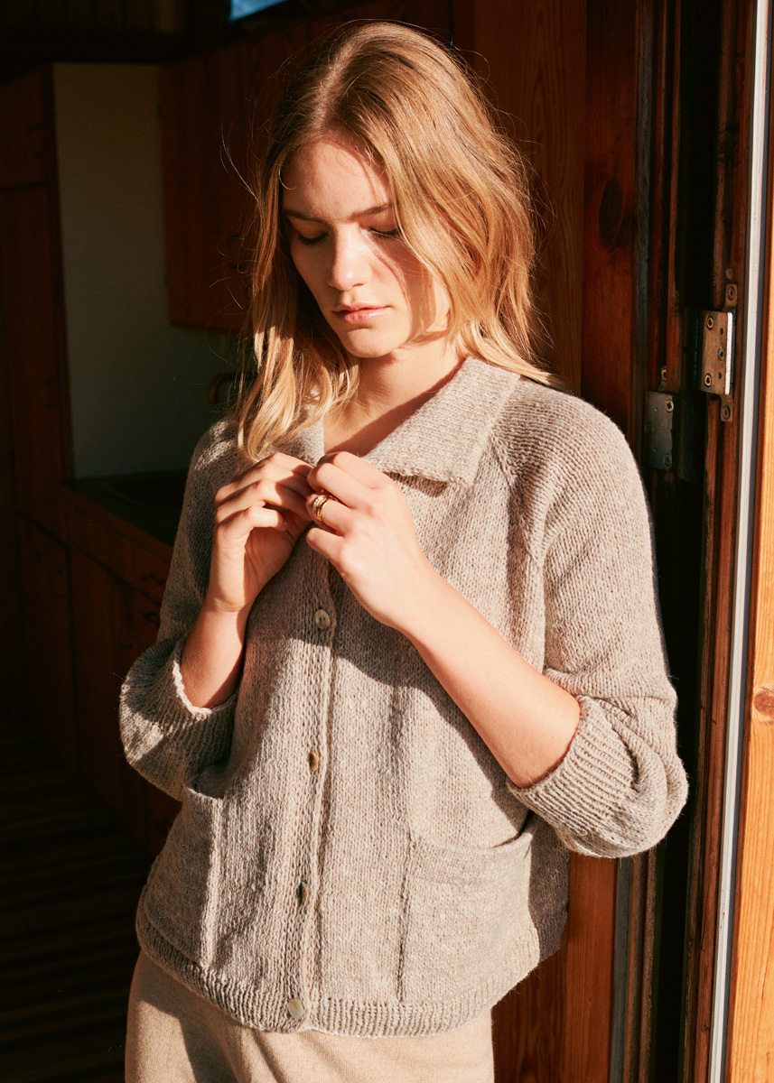450 (500, 550) g of Lana Grossa Cara (57% baby alpaca, 33% cotton, 10% Merino wool) in Beige (col 3). Size 3.5 and 4.5 mm needles; size 3.5 mm circular needles, 60 and 120 cm long; size 4.5 mm circular needles, 40, 80 and 120 cm long; one set each size 3.5 and 4.5 mm double-pointed needles [dpns]; 4 locking st markers; five 15 mm motherof- pearl buttons