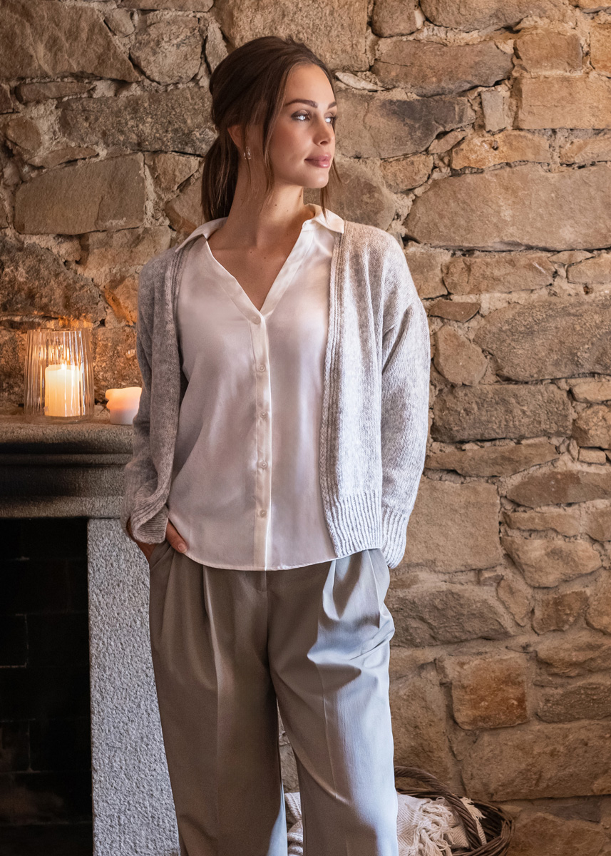 The cardigan has a total length of 54 (55 - 56 - 57 - 58 - 59) cm and a positive ease of 12 cm at 80 (88 - 96 - 104 - 116 - 128) cm chest circumference.
