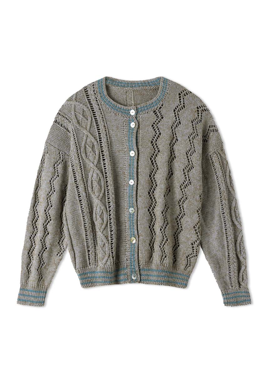 350 (400, 450) g of Lana Grossa Diversa (74% cotton, 26% viscose; 210 m/50 g) in Light Grey (col 28) and 50 g in Grey Blue (col 16). Size 2.5 and 3.5 mm needles; size 2.5 mm circular needle, 60 cm long; cable needle [cn]; seven 15 mm buttons [by Union Knopf, item 37604, col 12].