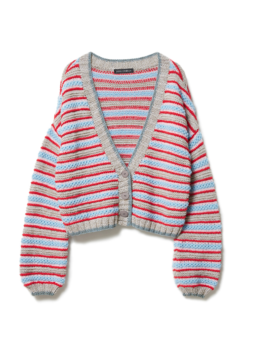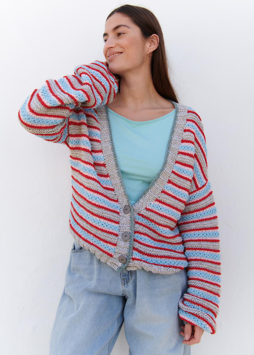 50 g of Lana Grossa Diversa (74% cotton, 26% viscose; 210 m/50 g) in Blue Grey (col 8) and 250 g in Natural (col 7); 100 g of Lana Grossa Riccio (84% cotton, 16% polyamide; 110 m/50 g) in Red (col 11); 100 g of Lana Grossa Sottile (85% cotton, 15% Merino wool; 250 m/50 g) in Light Blue (col 8); 100 g of Lana Grossa Promessa (70% organic cotton, 30% recycled polyamide; 125 m/50 g) in Pink (col 5). Size 4.5 and 5 mm needles; size 4.5 mm circular needle, 80 cm long; three 25 mm buttons