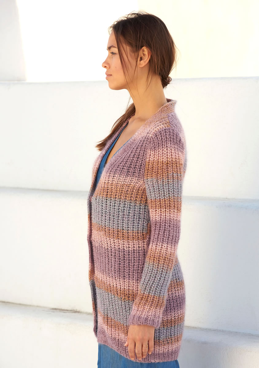 500 (550, 600) g of Lana Grossa Linarte Color(40% viscose, 30% cotton, 20% linen, 10% polyamide; 125 m/50 g) in Mint-Turquoise/Beige-Red/Antique-Violet/Ocher-Brown (col 201) and 125 (150, 175) g of Lana Grossa Silkhair (70% superkid mohair, 30% silk; 210 m/25 g) in Pale Purple (col 87). Size 5 mm needles; three 20 mm sew-on snap buttons in antique pink [by Union Knopf, item 19630, col 56].