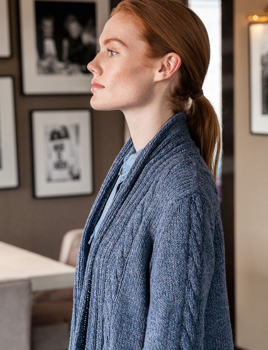 500 (550, 600) g of Lana Grossa Mary’s Tweed (33% baby alpaca, 30% Merino wool, 26% polyamide, 11% silk; 135 m/50 g) in Grey/Blue Mélange (col 12). Size 5 mm needles; cable needle [cn]