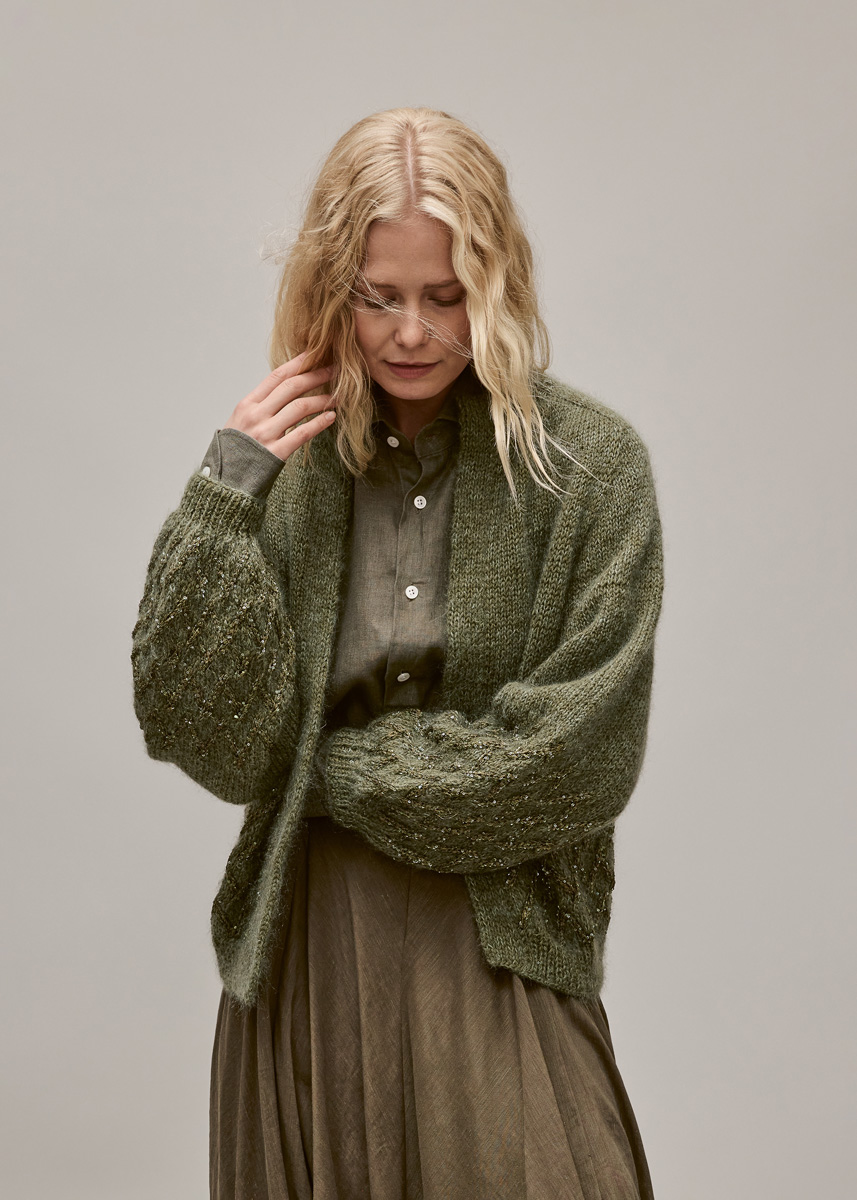 350 g of Lana Grossa Natural Lama Fine (100% baby Lama; 150 m/50 g) in Olive Green (col 119); 125 g of Lana Grossa Silkhair (70% superkid mohair, 30% silk; 210 m/25 g) in Moss Green (col 127); 200 g of Lana Grossa Glamour (55% polyamide, 45% polyester; 112 m/25 g) in Olive (col 17). Size 3.5 and 4.5 mm circular needles, each 80 – 100 cm long; short size 3.5 and 4.5 mm circular needles.