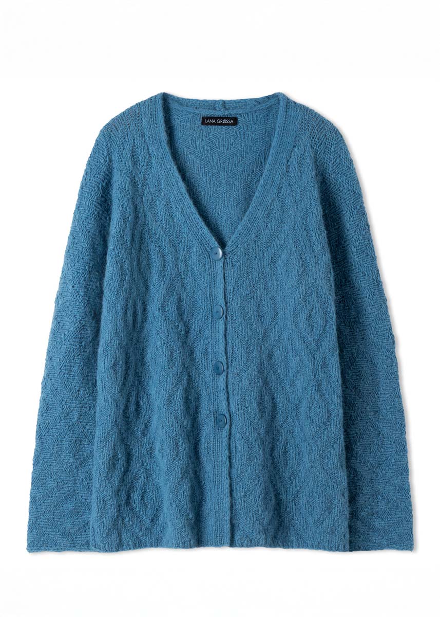 400 g of Lana Grossa Nebbia (55% extrafine Merino wool, 45% baby alpaca; 170 m/50 g) in Dove Blue (col 5). Size 5 mm needles; size 5 mm circular needle, 120 cm long; stitch holders; four 25 mm buttons in blue [by Union Knopf, item 454233, col 64].