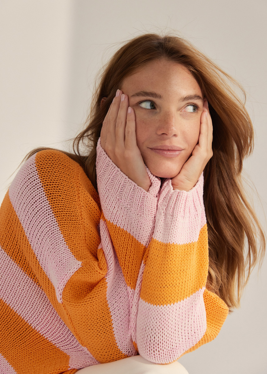 350 (400, 450) g of Lana Grossa Promessa (70% organic cotton, 30% recycled polyamide; 125 m/50 g) in Pink (col 5) and 250 (300, 350) g in Orange (col 4). Size 5 and 7 mm needles; size 5 mm circular needle, 100 cm long