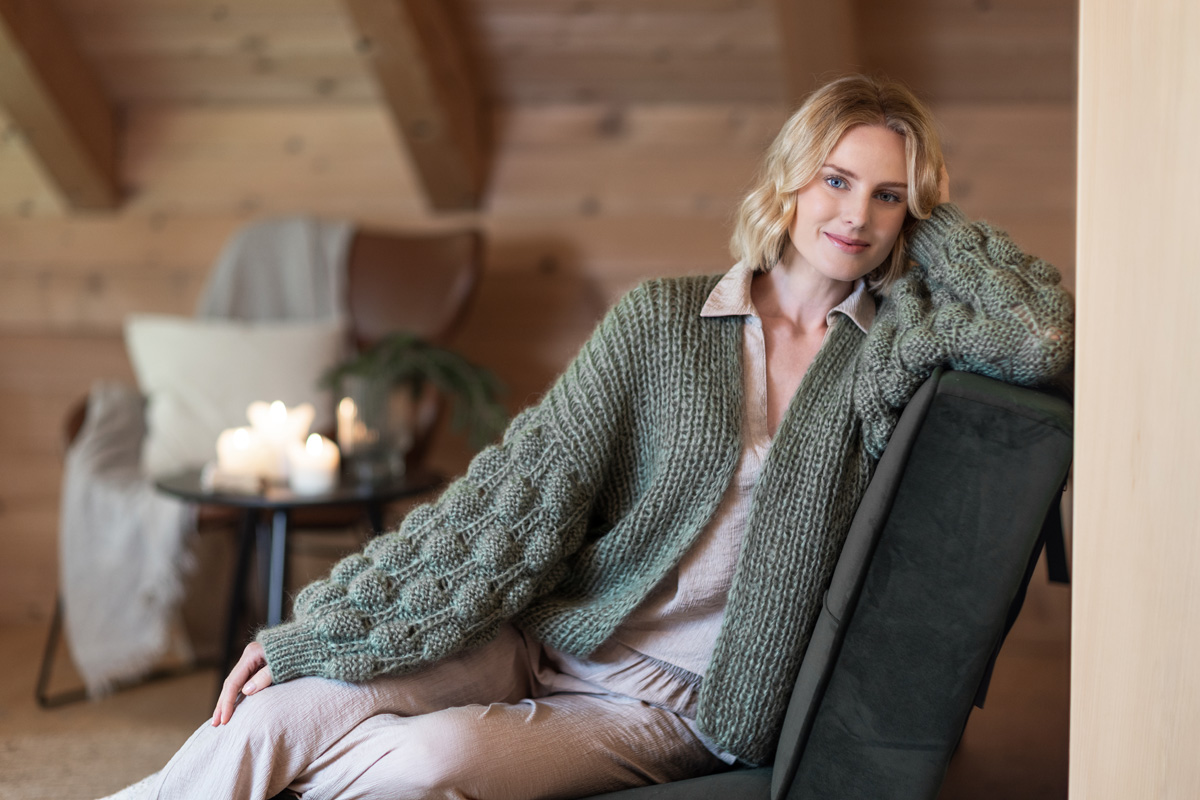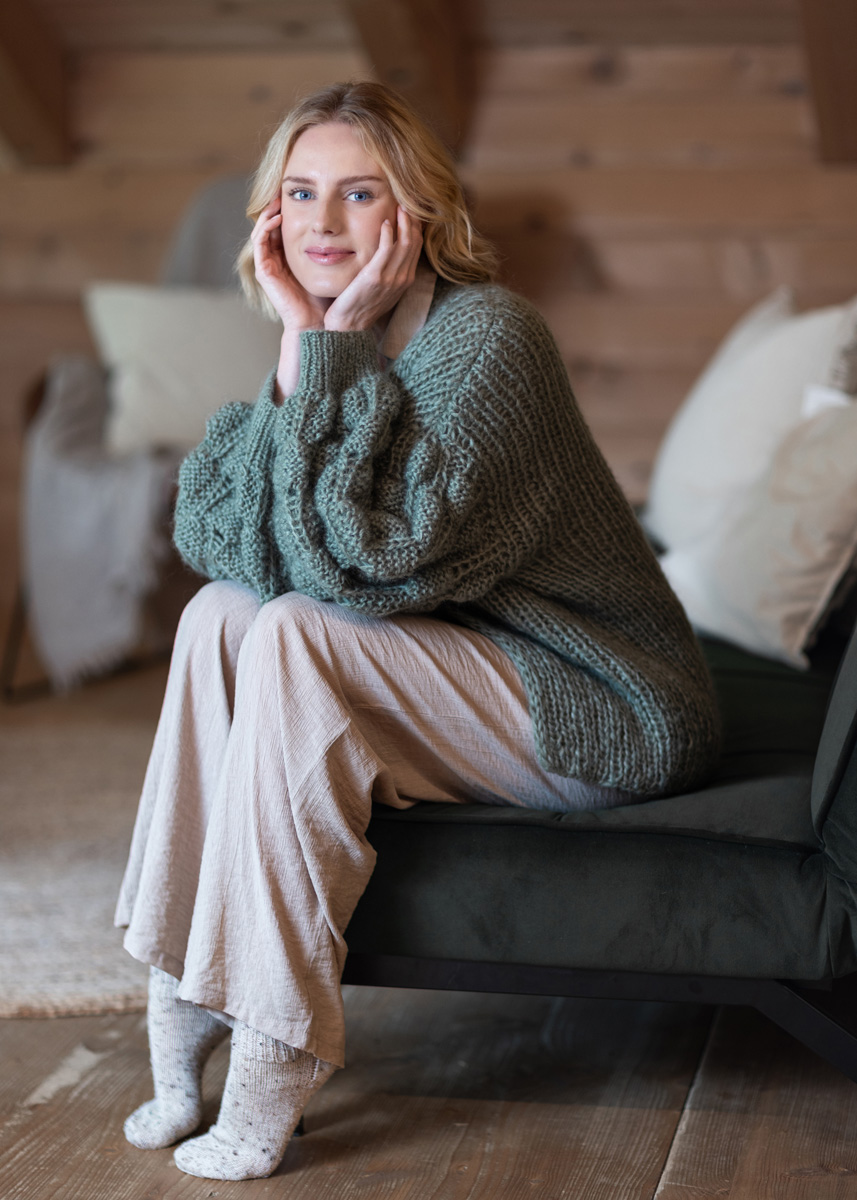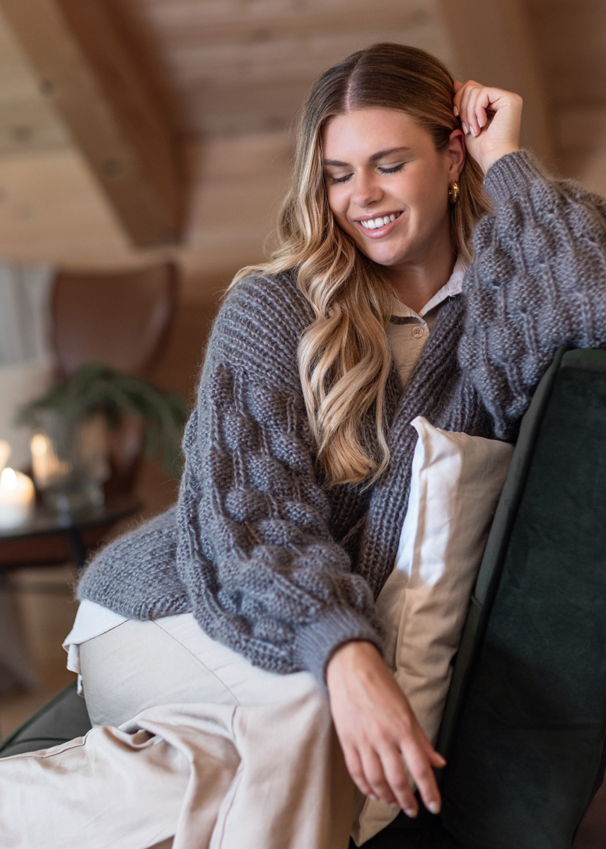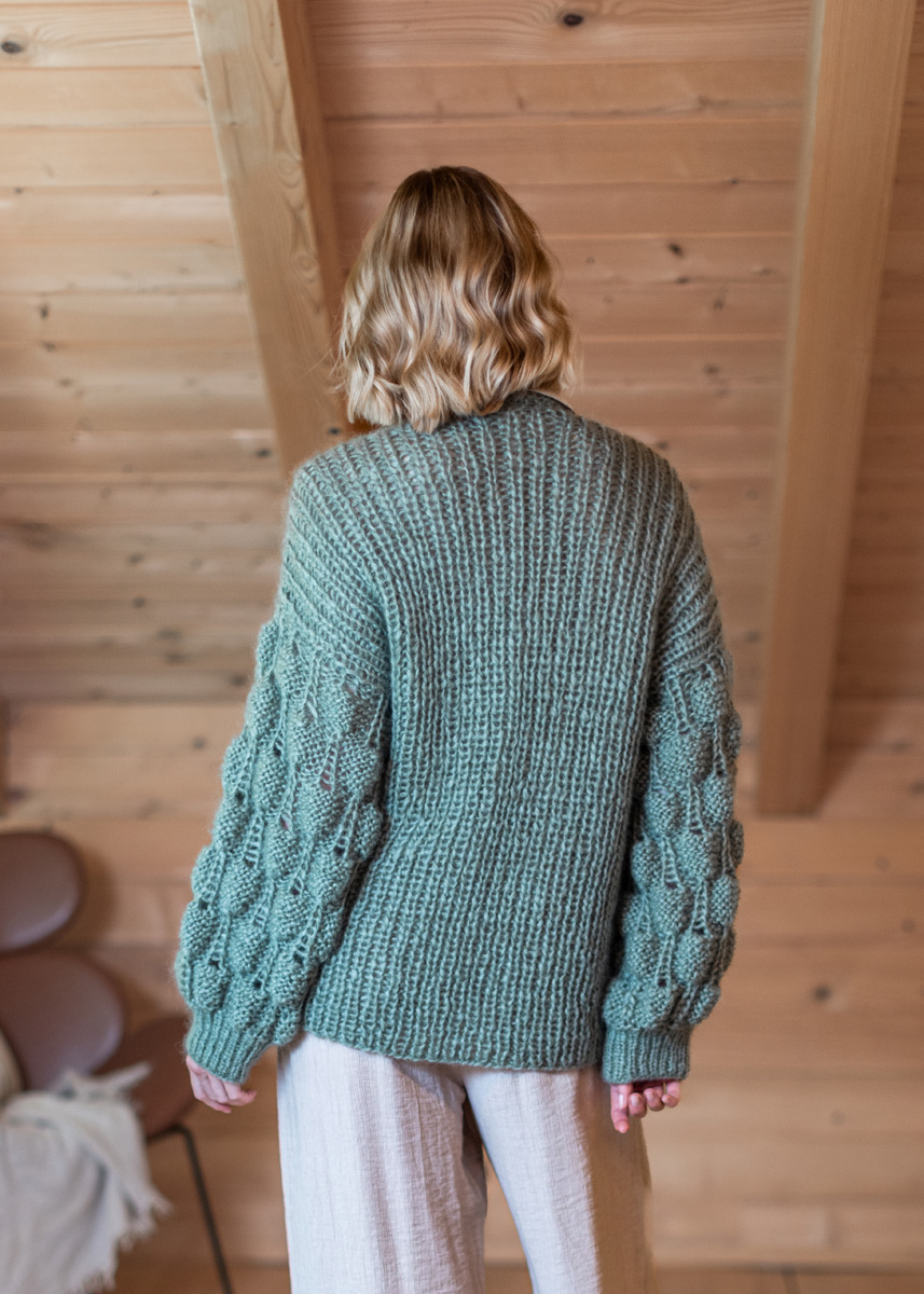 The cardigan is knitted throughout with 2 strands held together. Back and front panels are knitted in the round and are seperated at the armholes. Stitches are then picked up from the armholes and sleeves are knitted in the round. The cardigan has a total length of 60 (62 - 64 - 66 - 68 - 70) cm and a positive ease of 4 cm at 80 cm bust circumference (3 cm at 88 cm bust circumference - 4 cm at 96 cm bust circumference - 3 cm at 104 cm bust circumference - 4 cm at 116 cm bust circumference - 3 cm at 128 cm bust circumference).