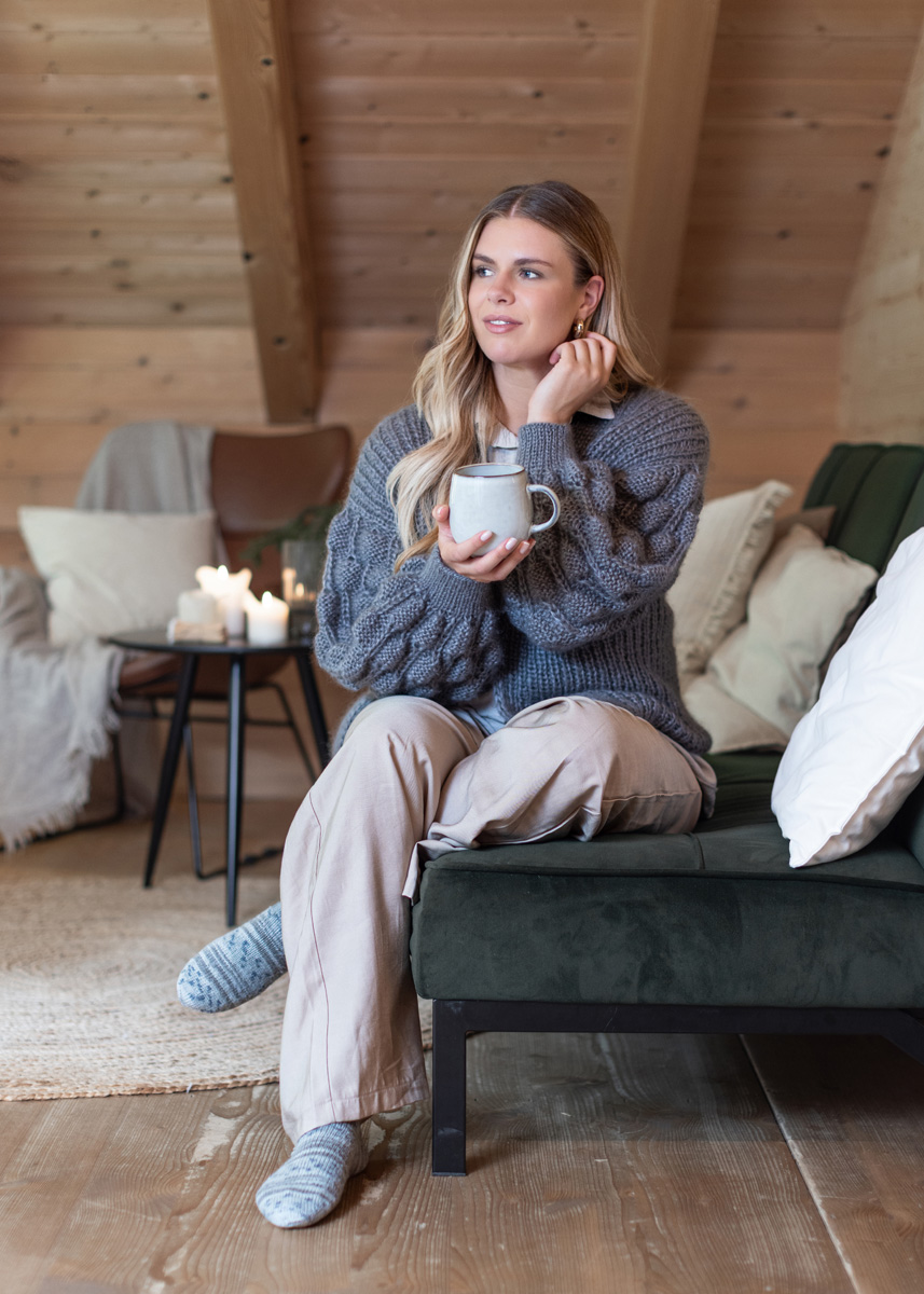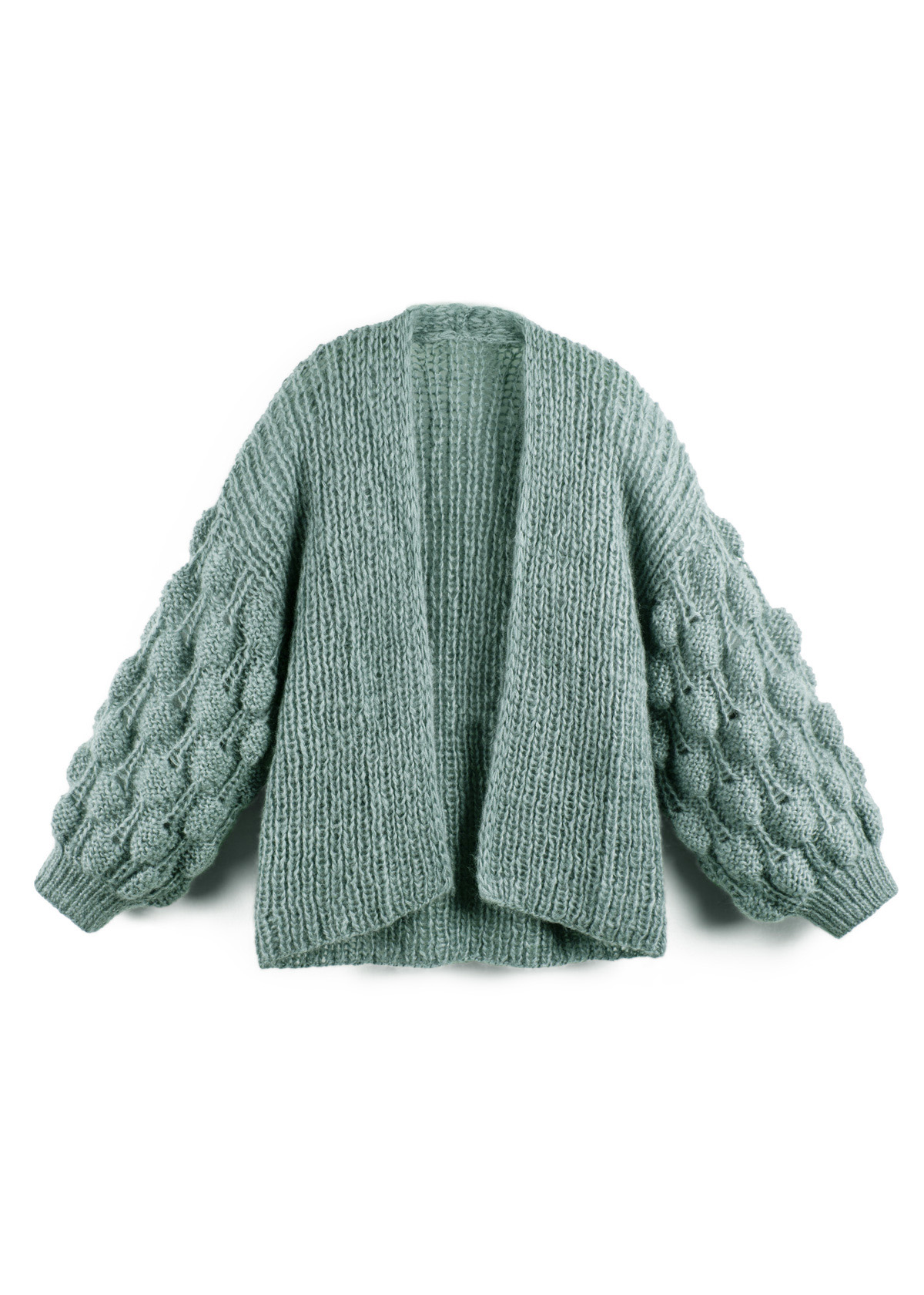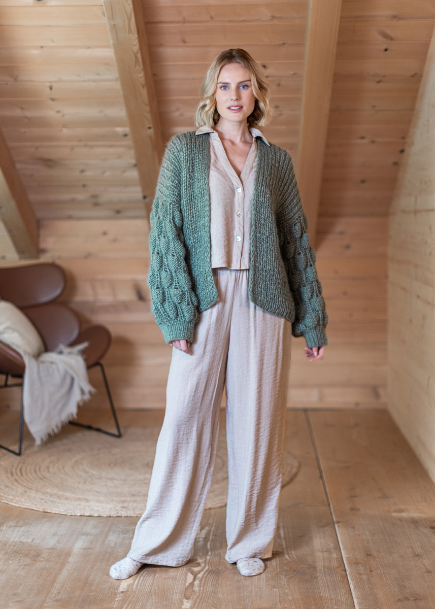The cardigan is knitted throughout with 2 strands held together. Back and front panels are knitted in the round and are seperated at the armholes. Stitches are then picked up from the armholes and sleeves are knitted in the round. The cardigan has a total length of 60 (62 - 64 - 66 - 68 - 70) cm and a positive ease of 4 cm at 80 cm bust circumference (3 cm at 88 cm bust circumference - 4 cm at 96 cm bust circumference - 3 cm at 104 cm bust circumference - 4 cm at 116 cm bust circumference - 3 cm at 128 cm bust circumference).