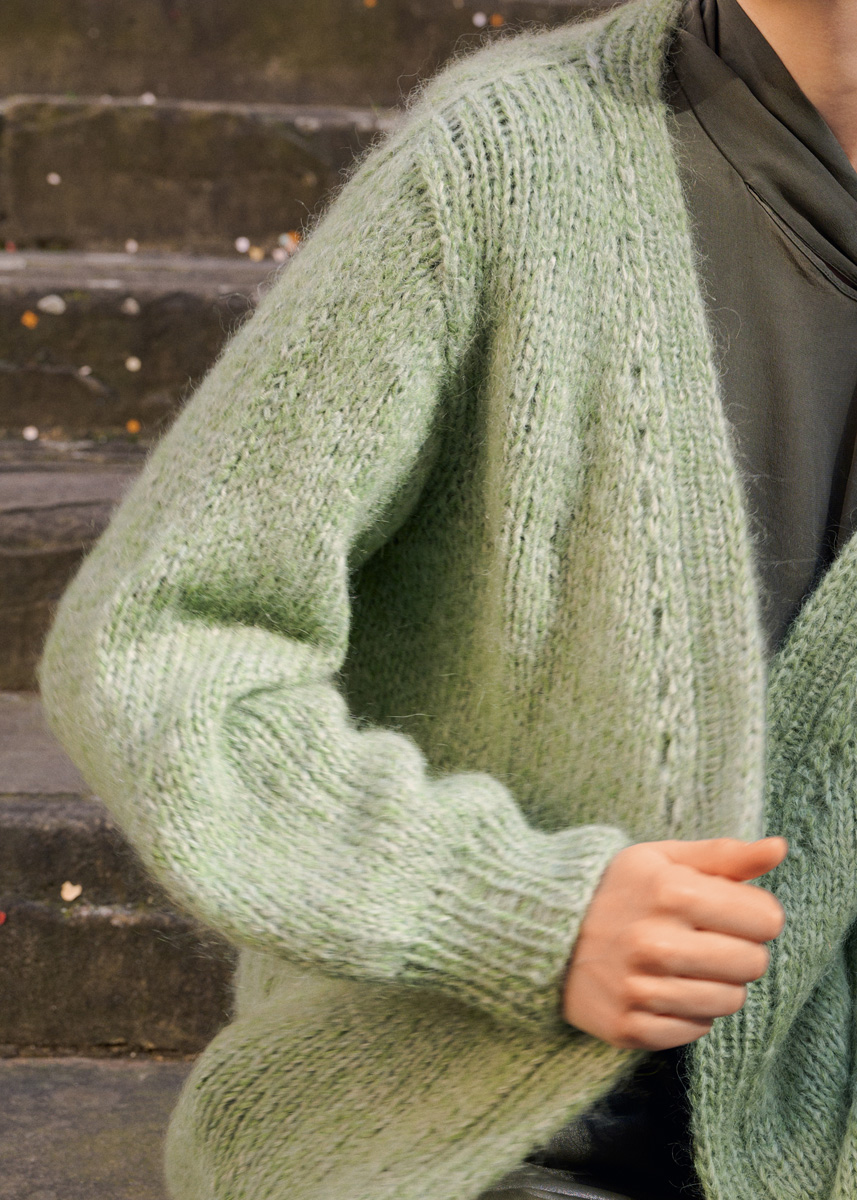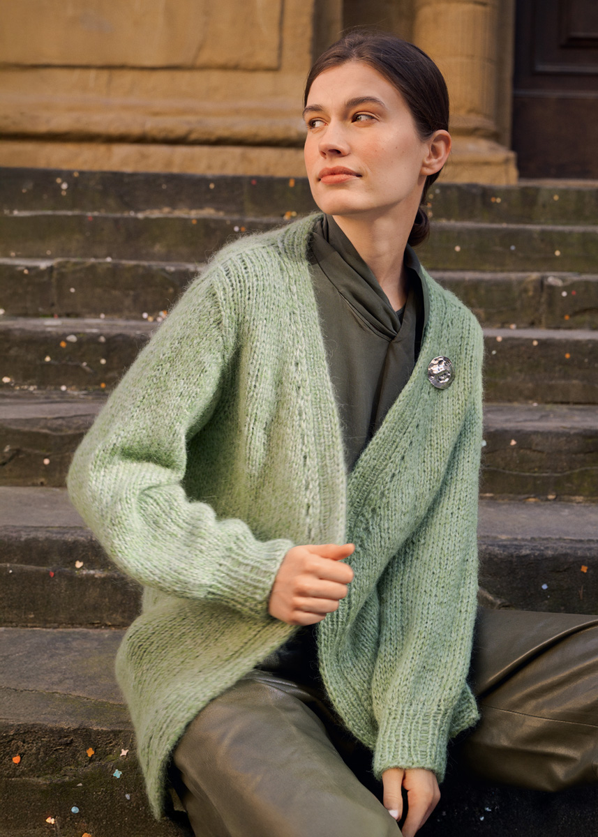200 (225, 250, 275) g of Lana Grossa Superkid Seta (65% superkid mohair, 35% silk; 100 m/25 g) in Grey Green (col 17); 100 (125, 125, 150) g each of Lana Grossa Setasuri (69% Suri alpaca, 31% silk; 212 m/25 g) in Apple Green (col 72) and Light Sea Green (col 41). Long size 5, 6.5 and 8 mm circular needles; short size 8 mm circular needle; one set size 6.5 mm double-pointed needles [dpns].