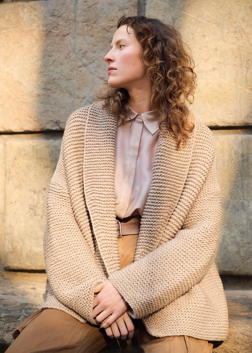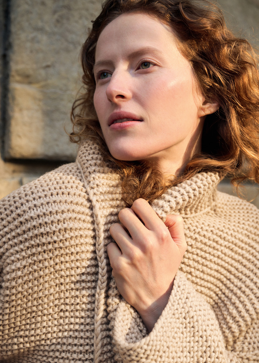 900 (950, 1000, 1050) g of Lana Grossa Winter Softness (62% extrafine Merino wool, 38% organic cotton; 70 m/50 g) in Beige (col 18). Size 6 and 7 mm needles.
