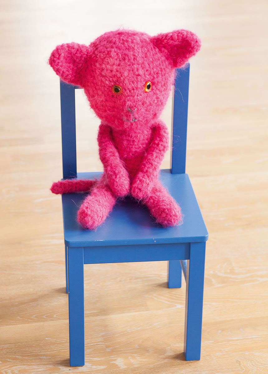 150 g of Lana Grossa Lala Berlin Hairy (42% acrylic, 37% baby alpaca, 14% extrafine Merino wool, 7% polyamide; 80 m/50 g) in Pink (col 21). Small amount of grey yarn for mouth and nose; size 6 mm crochet hook; blunt yarn needle; two 23 mm animal eye buttons in light brown [by Union Knopf, item 45462, col 16]; fiber fill by Prym.