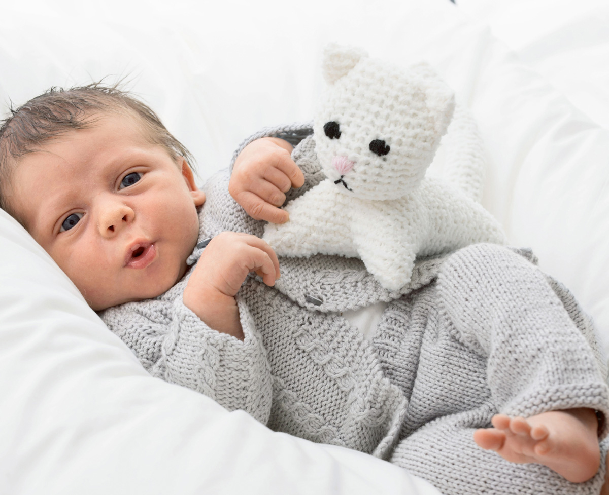 50 g of Lana Grossa Baby Soft (60% polyamide, 40% cotton; 150 m/50 g) in White (col 1); 50 g each of Lana Grossa Cool Wool Baby (100% pure wool; 220 m/50 g) in Pink (col 216) and Black (col 278). Size 4 mm needles; tapestry needle; fiber fill