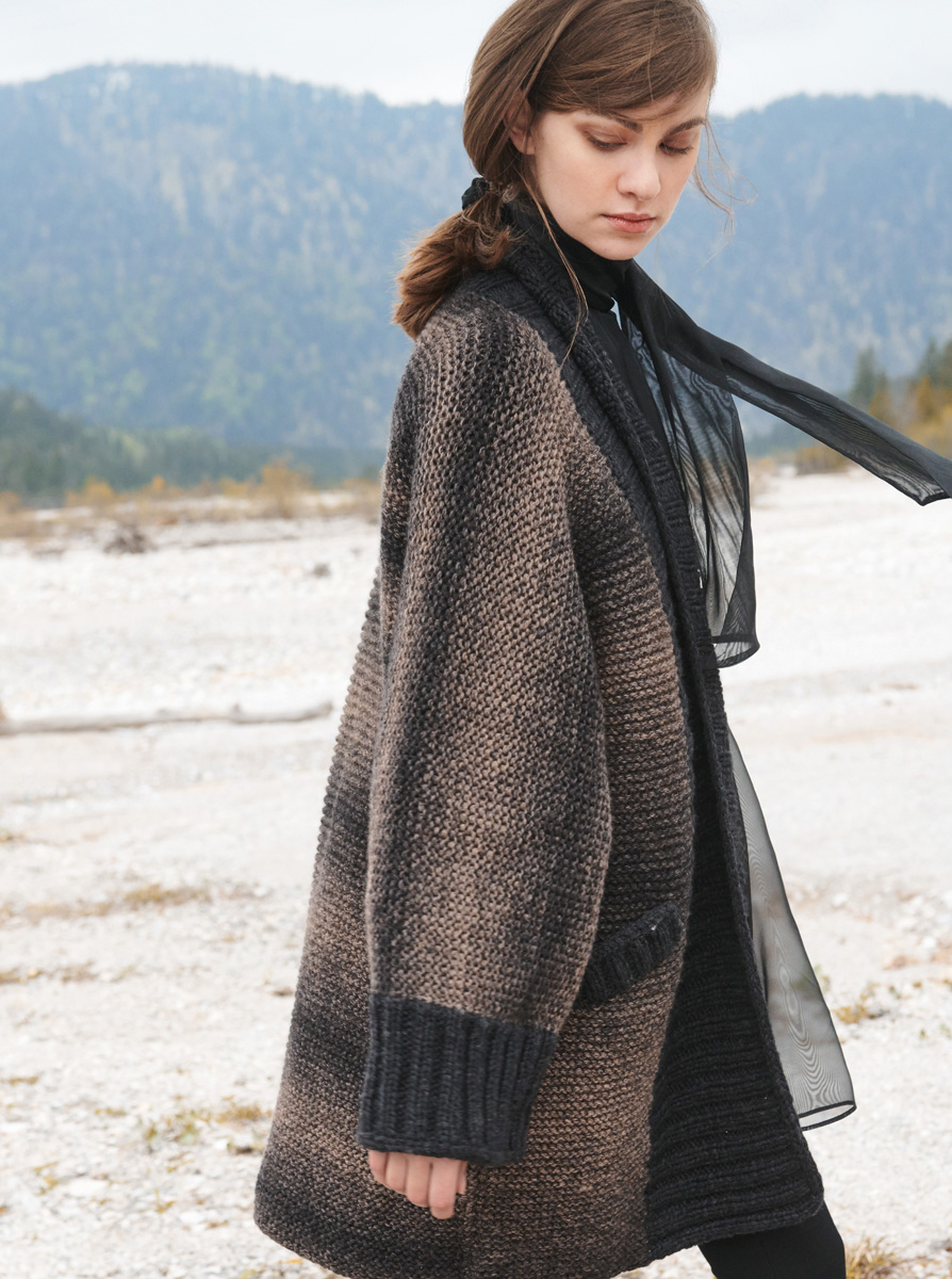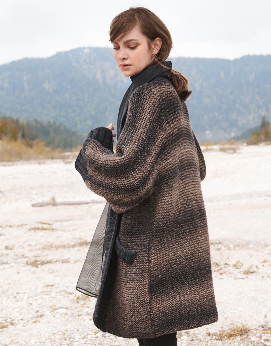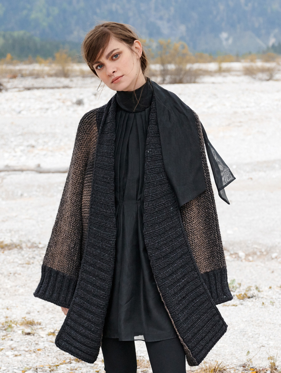 600 (650, 700, 750) g of Lana Grossa Alta Moda Cashmere 16 Sfumato (78% Merino wool, 12% cashmere, 10% polyamide; 220 m/100 g) in Grey/Brown Mélange (col 209) and 250 g of Lana Grossa Alta Moda Cashmere 16 (78% Merino wool, 12% cashmere, 10% polyamide; 110 m/50 g) in Charcoal (col 14). Size 8 mm circular needles, 60 and 100 cm long