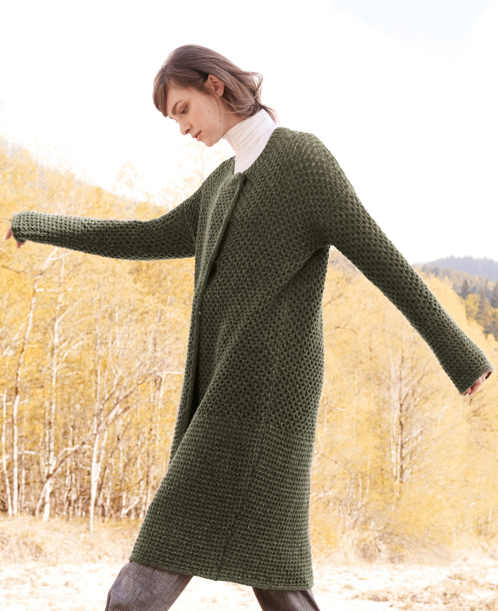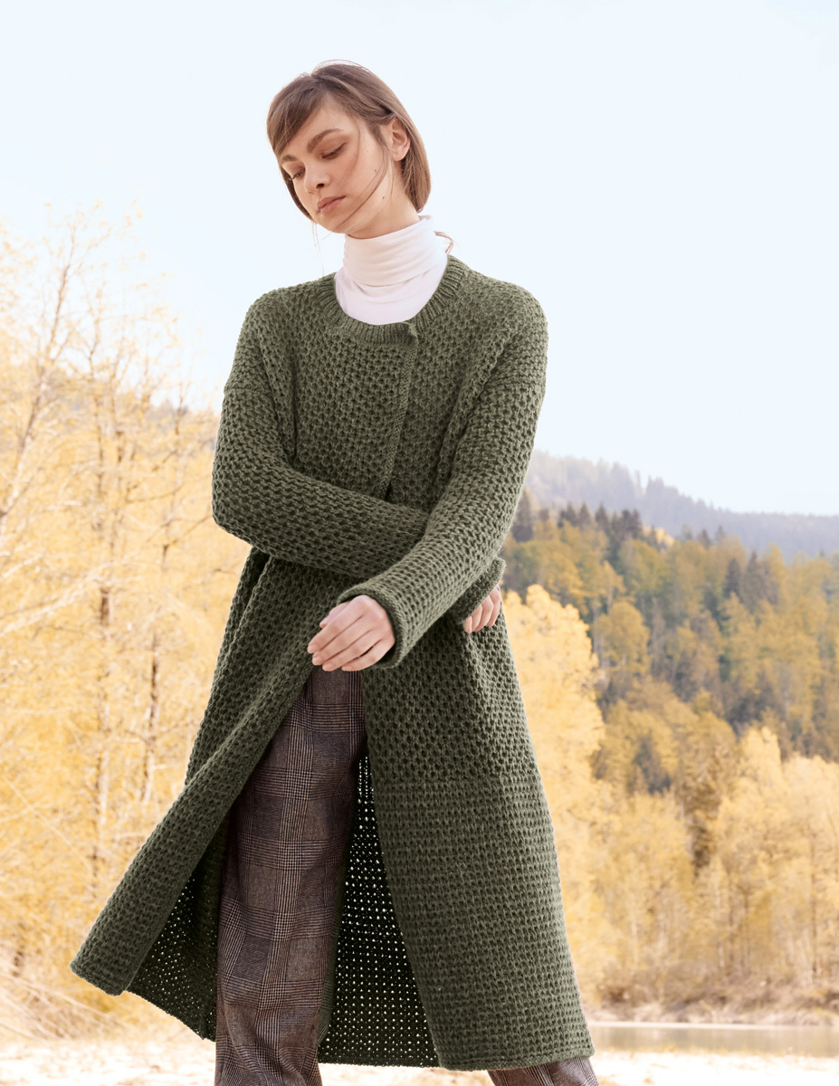 700 (750, 800, 850) g of Lana Grossa Fatto (62% Merino wool, 26% mohair, 12% polyamide; 175 m/50 g) in Dark Olive (col 20). Size 5 and 6 mm needles; size 6 mm circular needle, 40 cm long; two 25 mm snap buttons [by Union Knopf, item 19589, col 22]; one 20 mm snap button [item 19589, col 22]