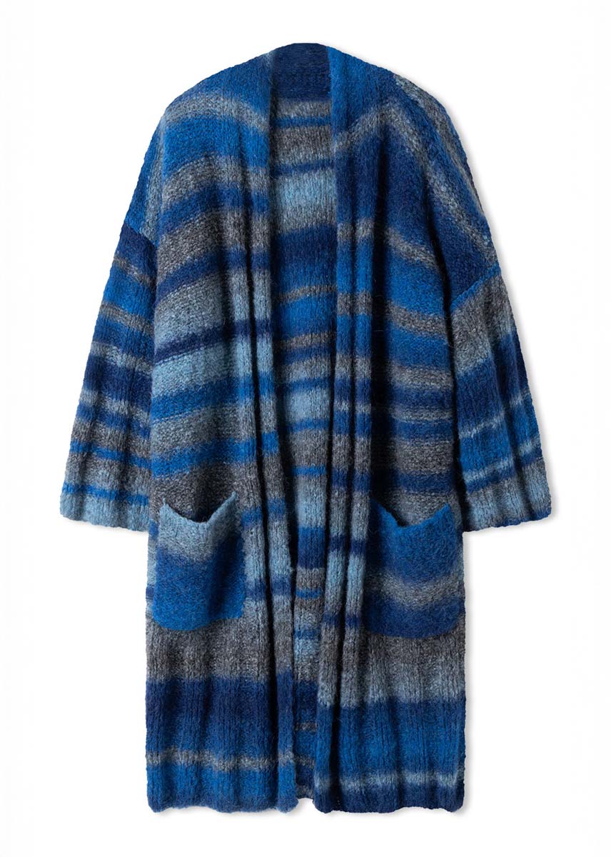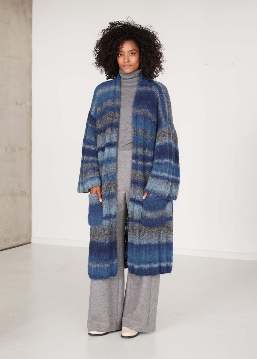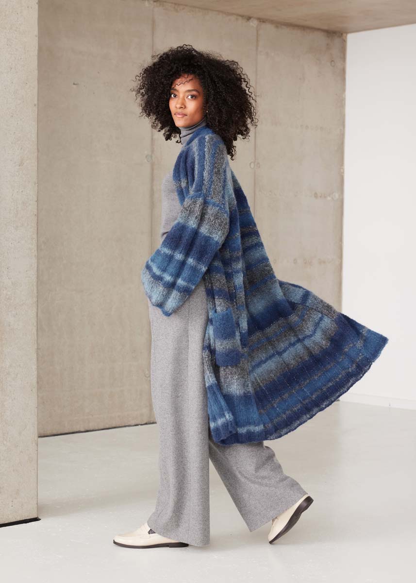 500 (600) g of Lana Grossa Gigante (70% fine alpaca, 30% polyamide; 300 m/100 g) in Dark Blue/Night Blue/Grey Blue/Grey (col 7). Size 7 mm needles; 2 stitch holders.