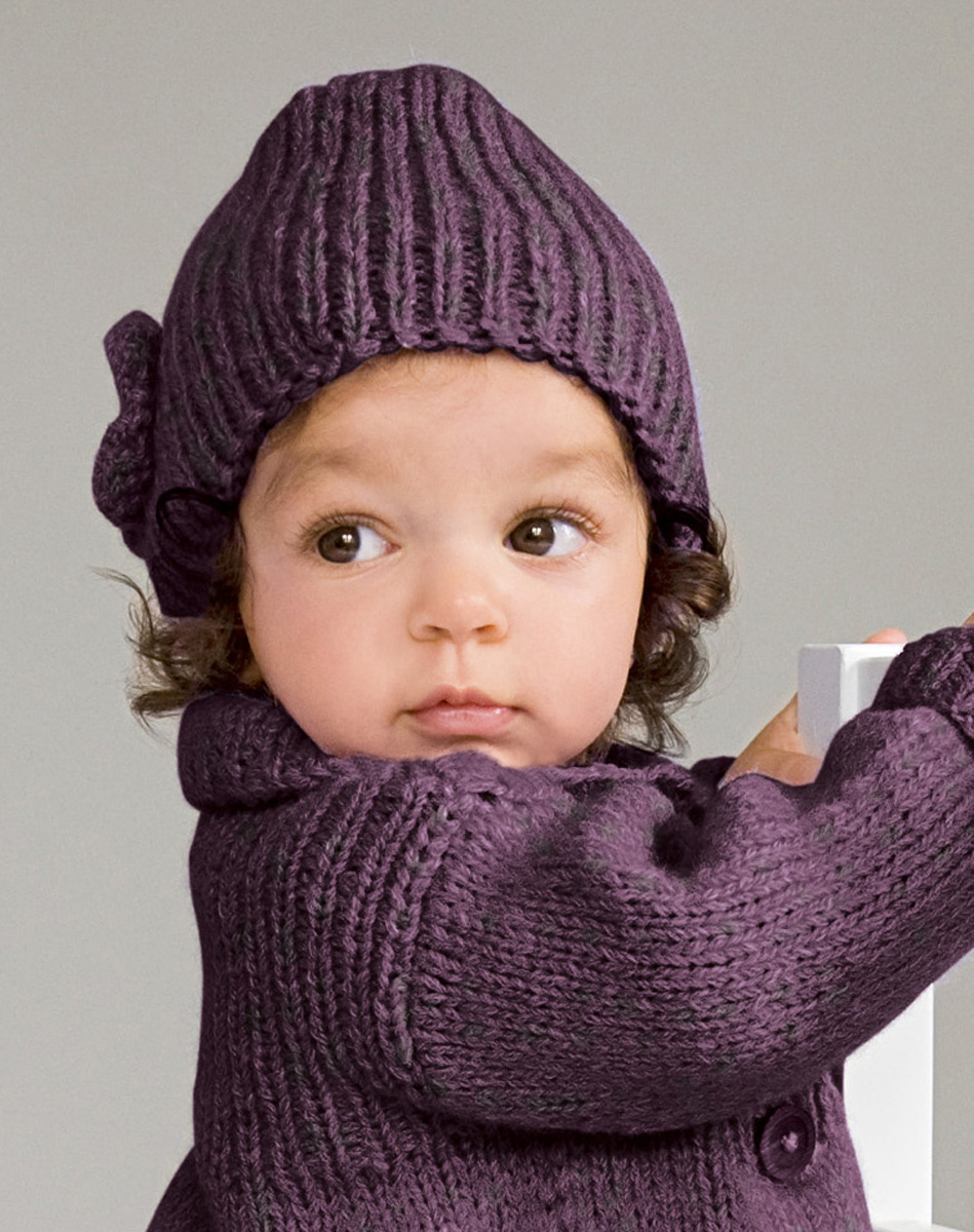 150 g of Lana Grossa Alta Moda Alpaca (90% alpaca, 5% pure wool, 5% polyamide; 140 m/50 g) in Blackberry/ Grey Mélange (col 20). Size 5 mm needles; one set size 5 mm double-pointed needles [dpns]; size 4.5 mm crochet hook; four buttons