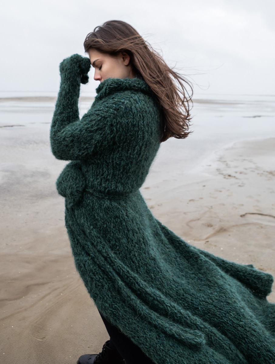 550 (600, 550) g of Lana Grossa Lala Berlin Furry (90% alpaca, 10% polyamide; 75 m/50 g) in Petrol Green (col 9). Size 8 and 10 mm needles; size 8 and 10 mm circular needles, each 40 cm long; size 7 mm crochet hook