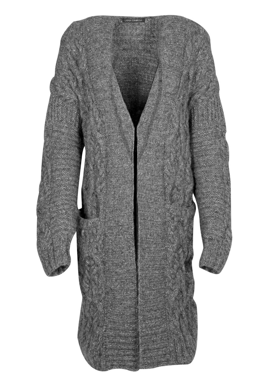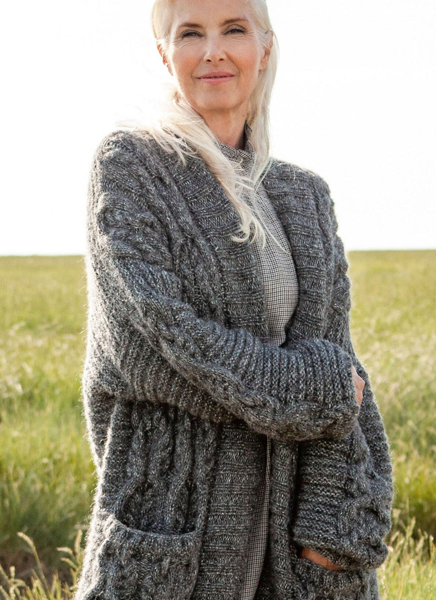 600 (650, 700) g of Lana Grossa Lala Berlin Shiny (46% baby alpaca, 30% cotton, 8% Merino wool, 8% polyester, 8% polyamide; 150 m/50 g) in Grey (col 6). Size 4.5 and 5.5 mm needles; size 4.5 mm circular needle, 100 cm long; 2 cable needles [cn]; size 4.5 mm crochet hook