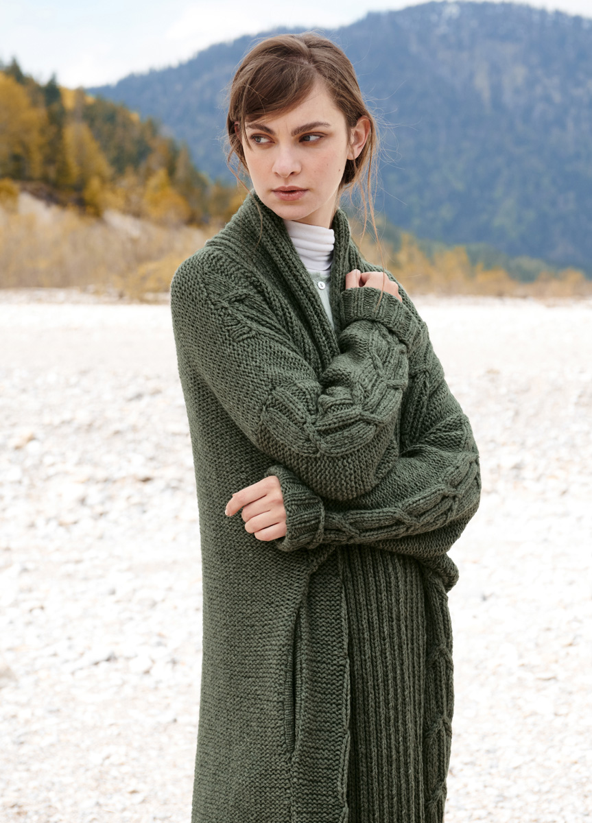 900 (1000, 1100) g of Lana Grossa Landlust Merino 120 (100% superwash Merino wool; 120 m/50 g) in Grey/Green (col 135) and 50 g of Lana Grossa Landlust Merino 180 (100% superwash Merino wool; 180 m/50 g) in Grey/Green (col 235). Size 5, 7 and 8 mm needles; cable needle [cn]