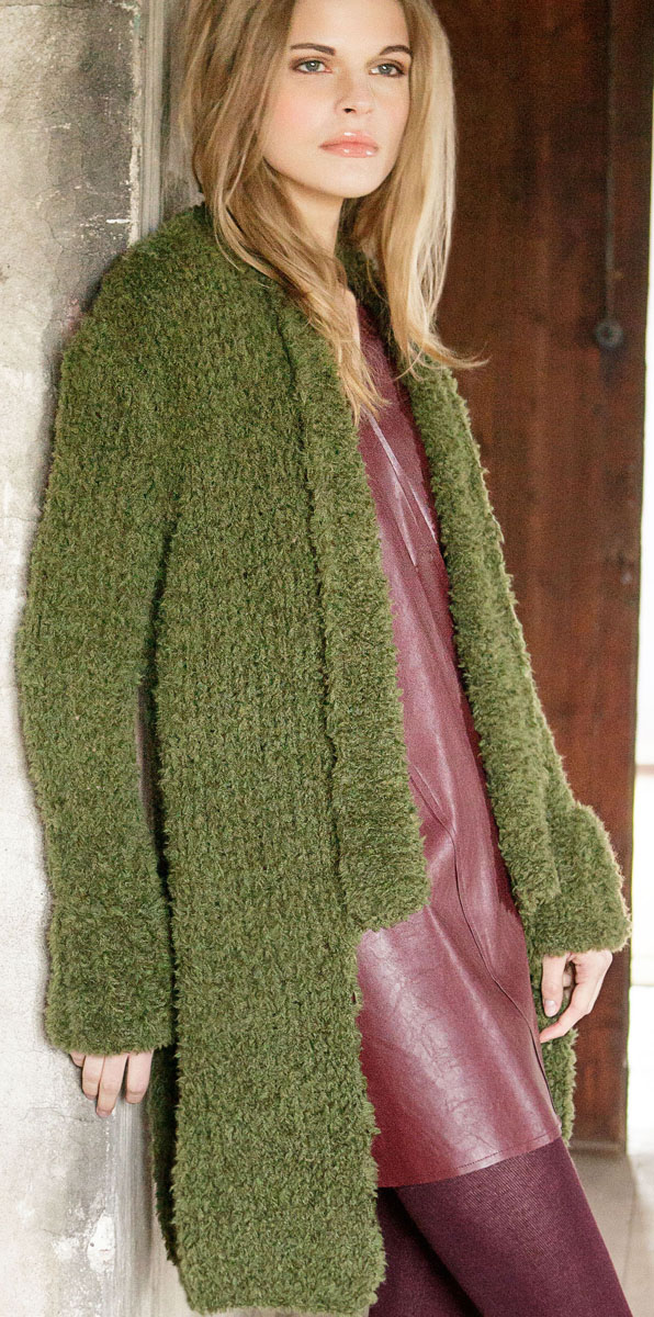 400 (450, 500) g of Lana Grossa Micio (60% Merino wool, 25% polyamide, 15% baby camel; 100 m/50 g) in Green (col 10). Size 7 and 8 mm needles