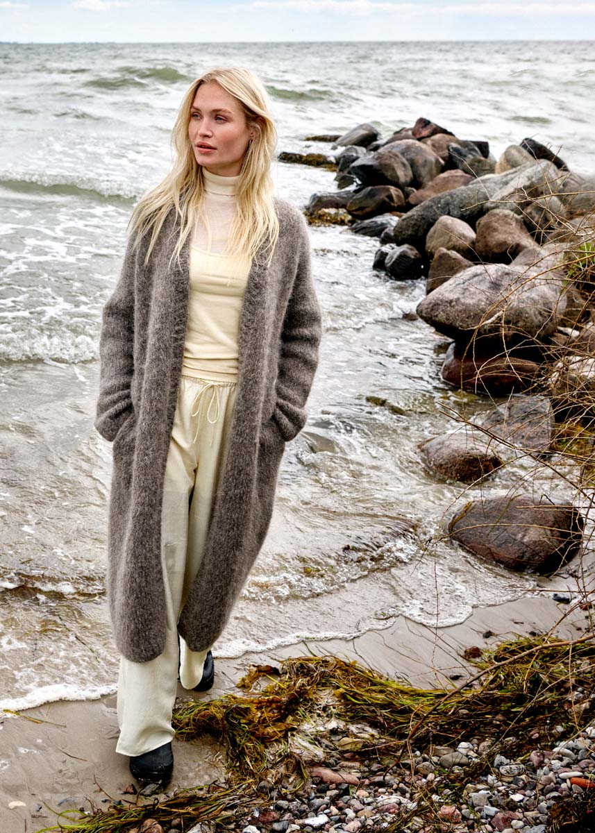 700 (800, 900, 1000) g of Lana Grossa Natural Alpaca Lungo (89% baby alpaca, 11% polyamide; 190 m/50 g) in Greige (col 20). Short and long size 5 and 6 mm circular needles; size 4.5 mm crochet hook; stitch markers.