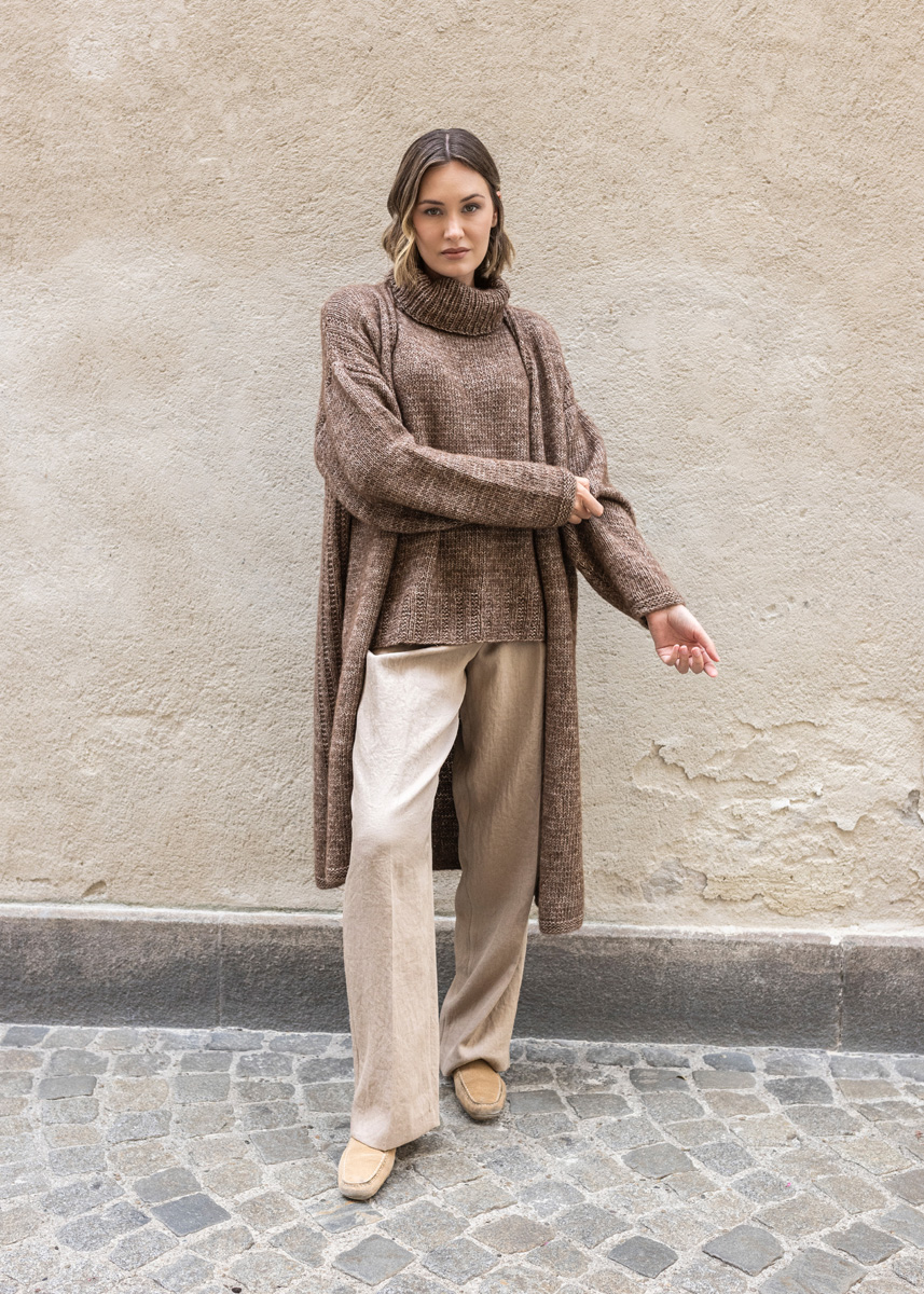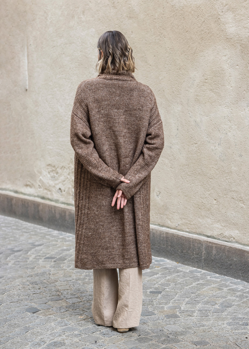 The coat has a total length of 98 (100 - 102 - 104 - 106 - 108) cm and a positive ease of 32 cm at 80 cm bust circumference (32 cm at 88 cm bust circumference - 32 cm at 96 cm bust circumference - 32 cm at 104 cm bust circumference - 28 cm at 116 cm bust circumference - 24 cm at 128 cm bust circumference).