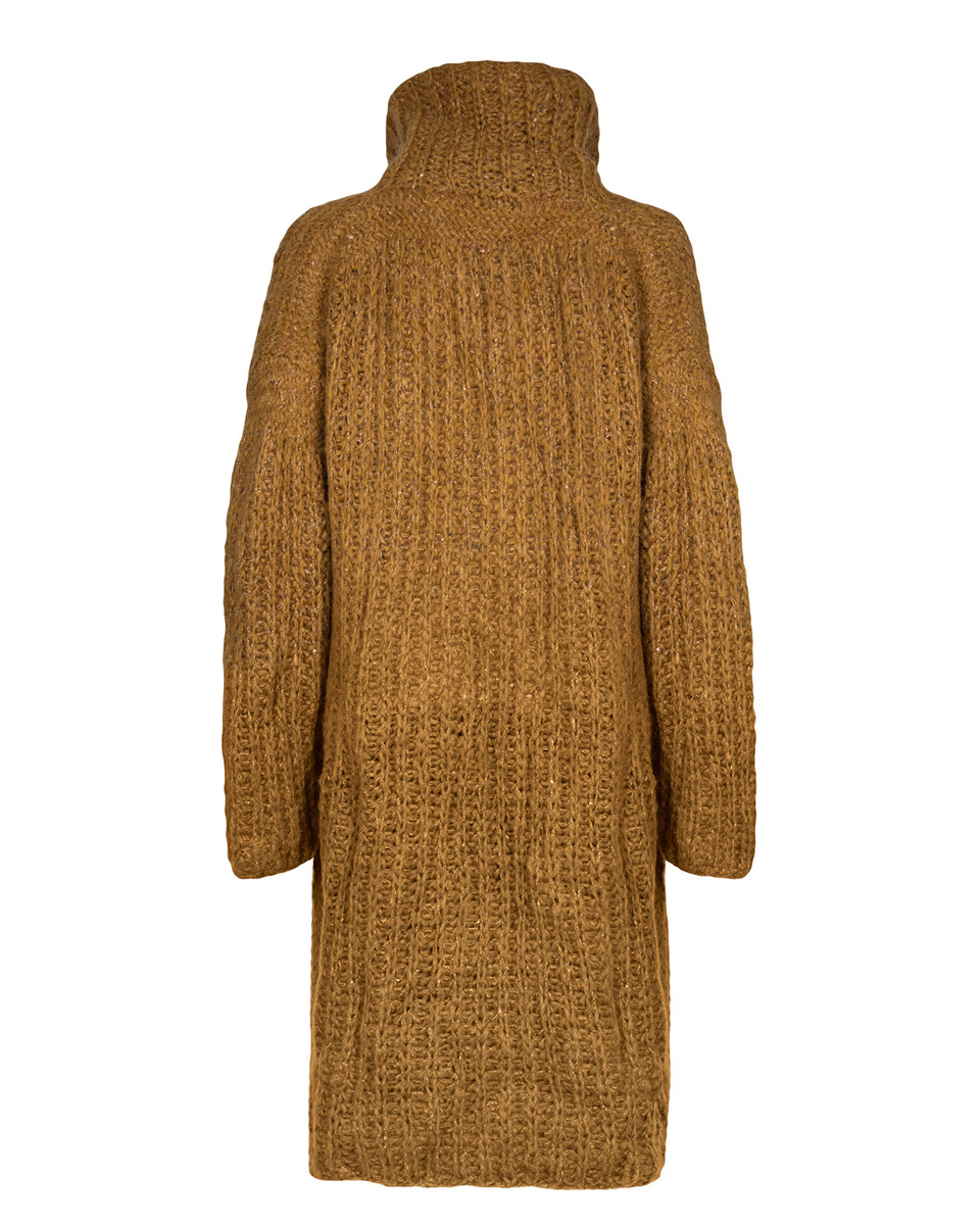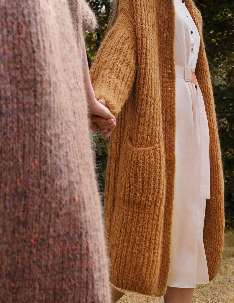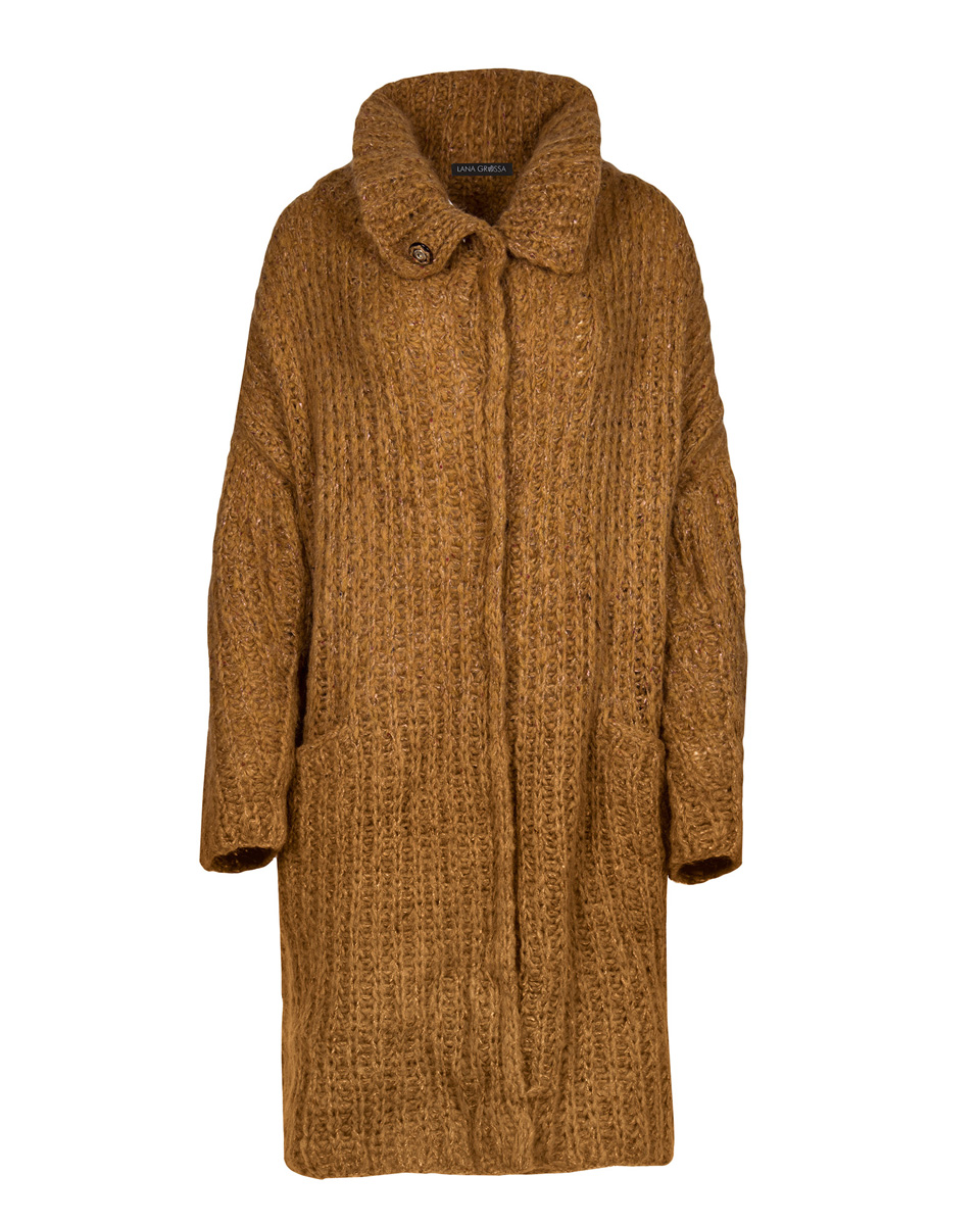 400 (450, 500) g of Lana Grossa Peru Tweed (40 % alpaca, 32 % viscose, 8 % pure wool, 20 % polyamide; 175 m / 50 g) in Gold- Brown (col 8) and 350 (400, 450) g of Lana Grossa Peloso (54 % pure wool, 26 % mohair, 20 % acrylic; 210 m / 50 g) in Gold-Brown (col 7). Size 8 mm needles; size 7 mm circular needle, 40 cm long; fi ve 27 mm snap buttons