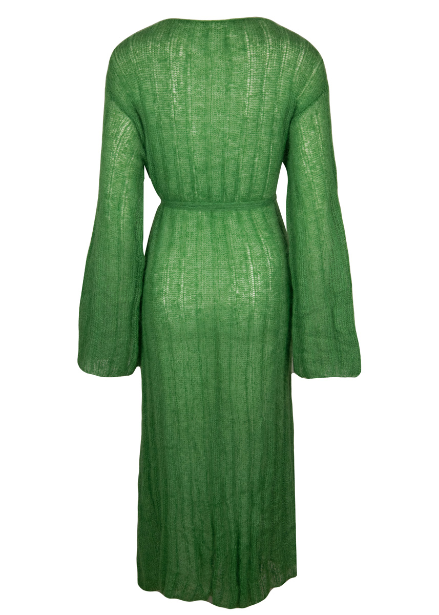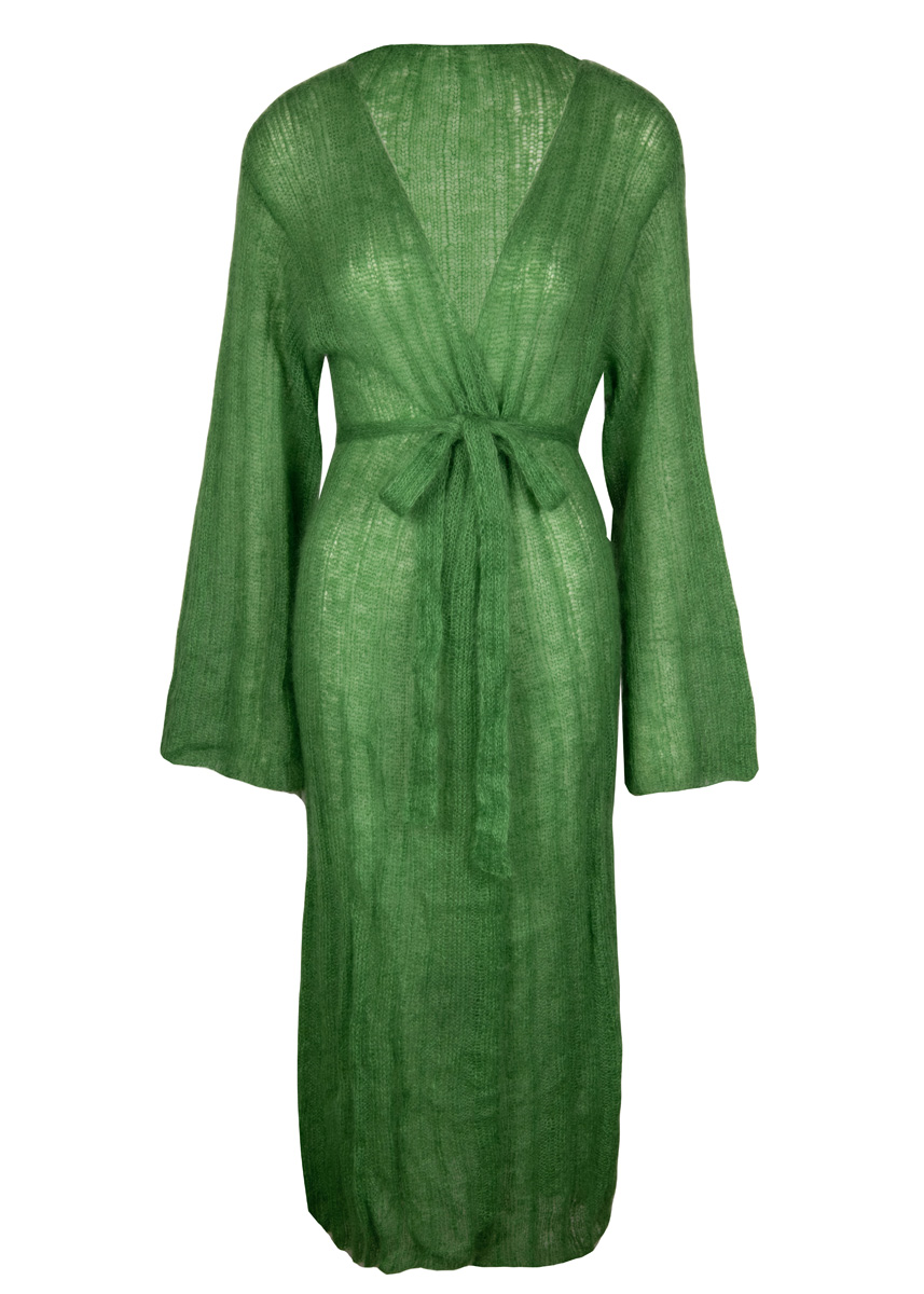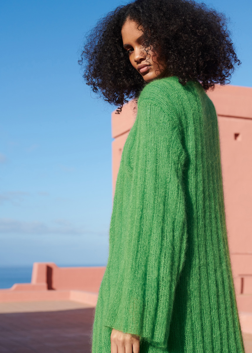 225 g of Lana Grossa Silkhair (70% superkid mohair, 30% silk; 210 m/25 g) in Green (col 142). Size 5 mm circular needle, 80 cm long; size 4 mm crochet hook