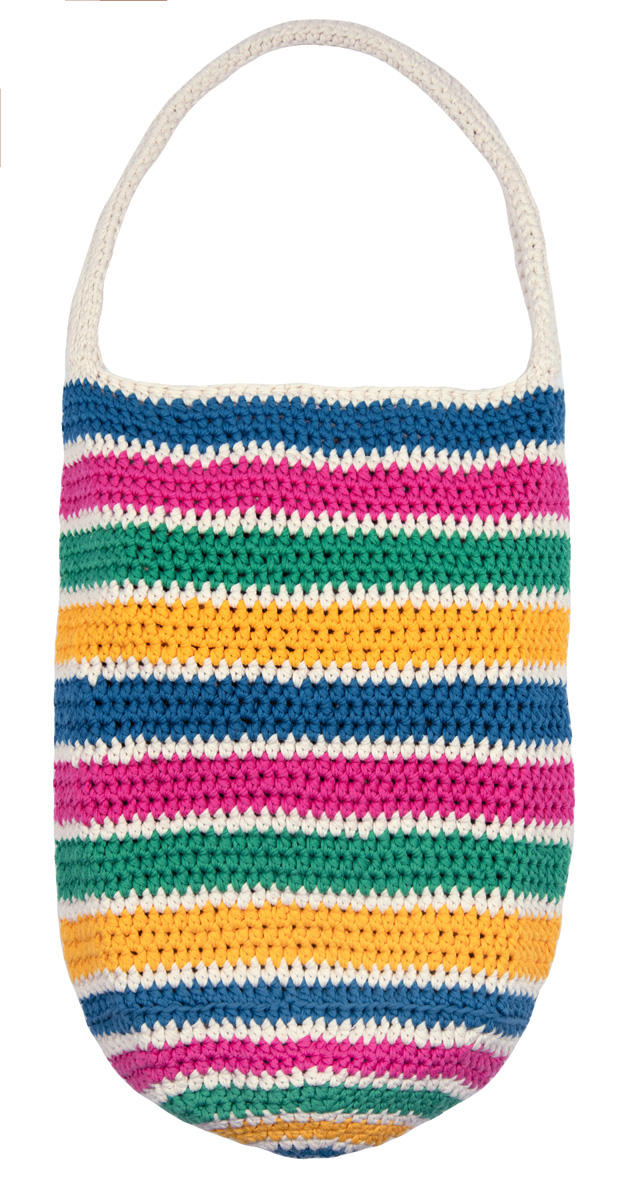 100 g each of Lana Grossa Organico (100% organic cotton; 90 m/50 g) in Pink (col 98), Orange (col 123), Green (col 129) and Ocean Blue (col 132); 200 g in Ecru (col 6). Size 6 mm crochet hook; tapestry needle