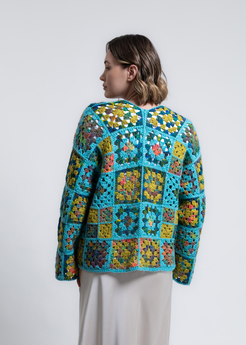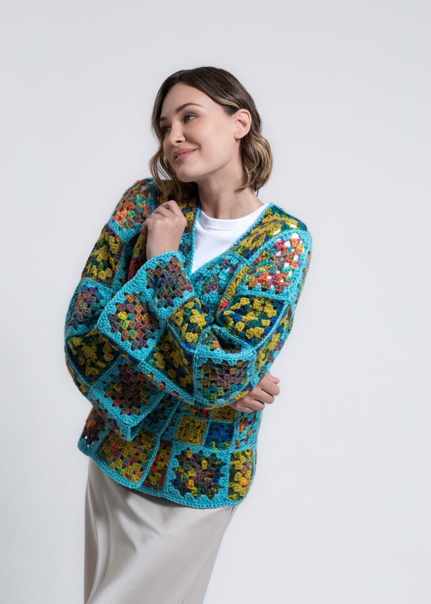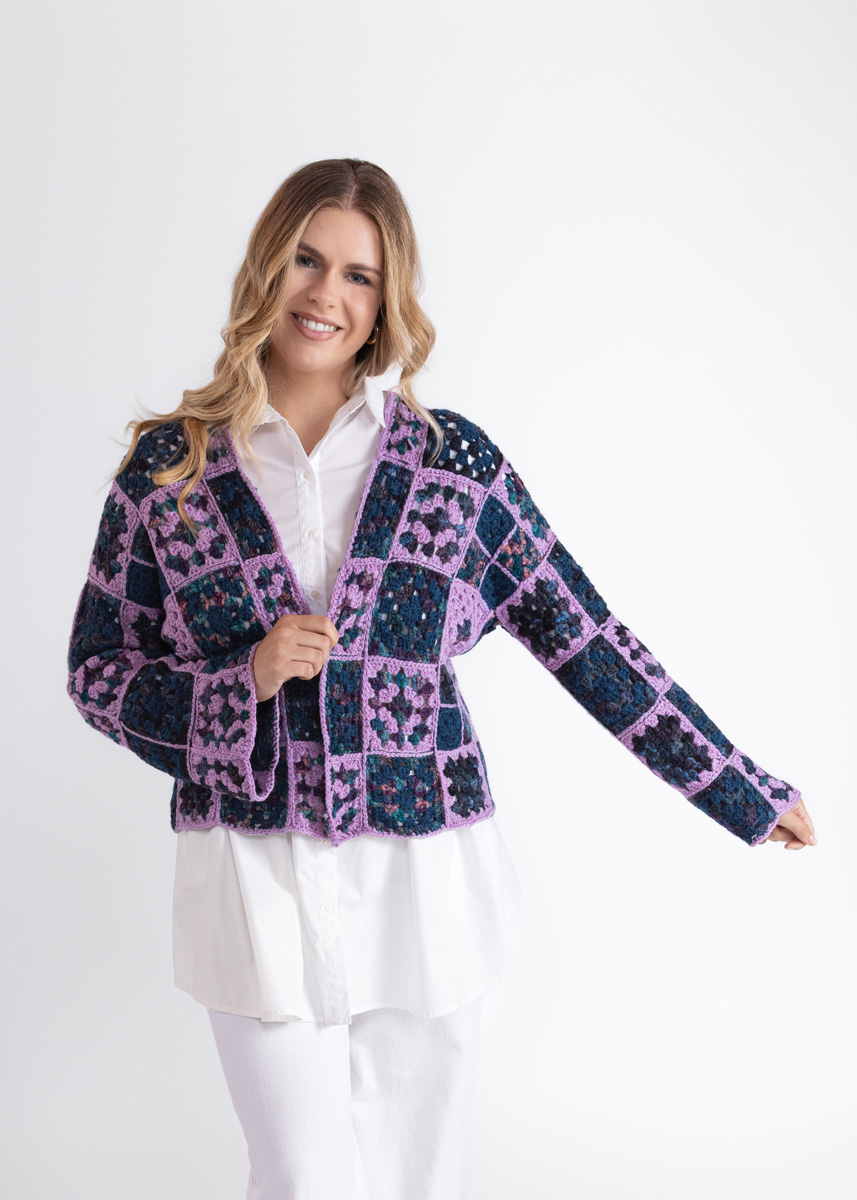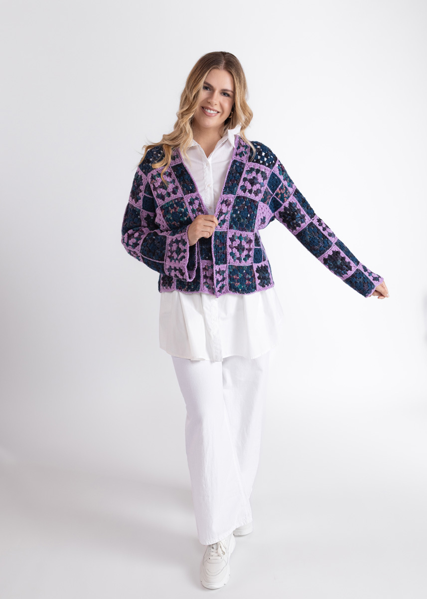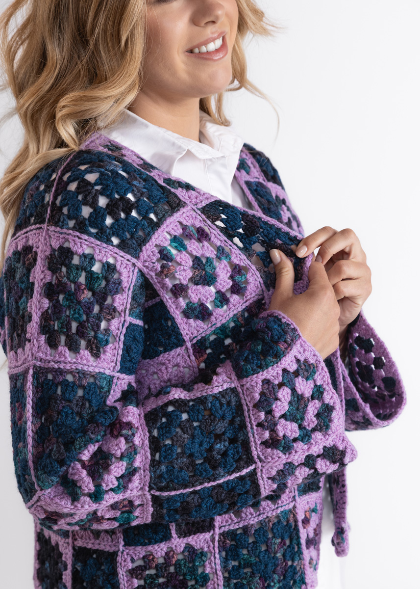 The cardigan has a total length of 55 (55 - 66) cm and a positive ease of 20-12 cm at 80-88 cm bust circumference (26-18 cm at 96-104 cm bust circumference - 28-16 cm at 116-128 cm bust circumference).