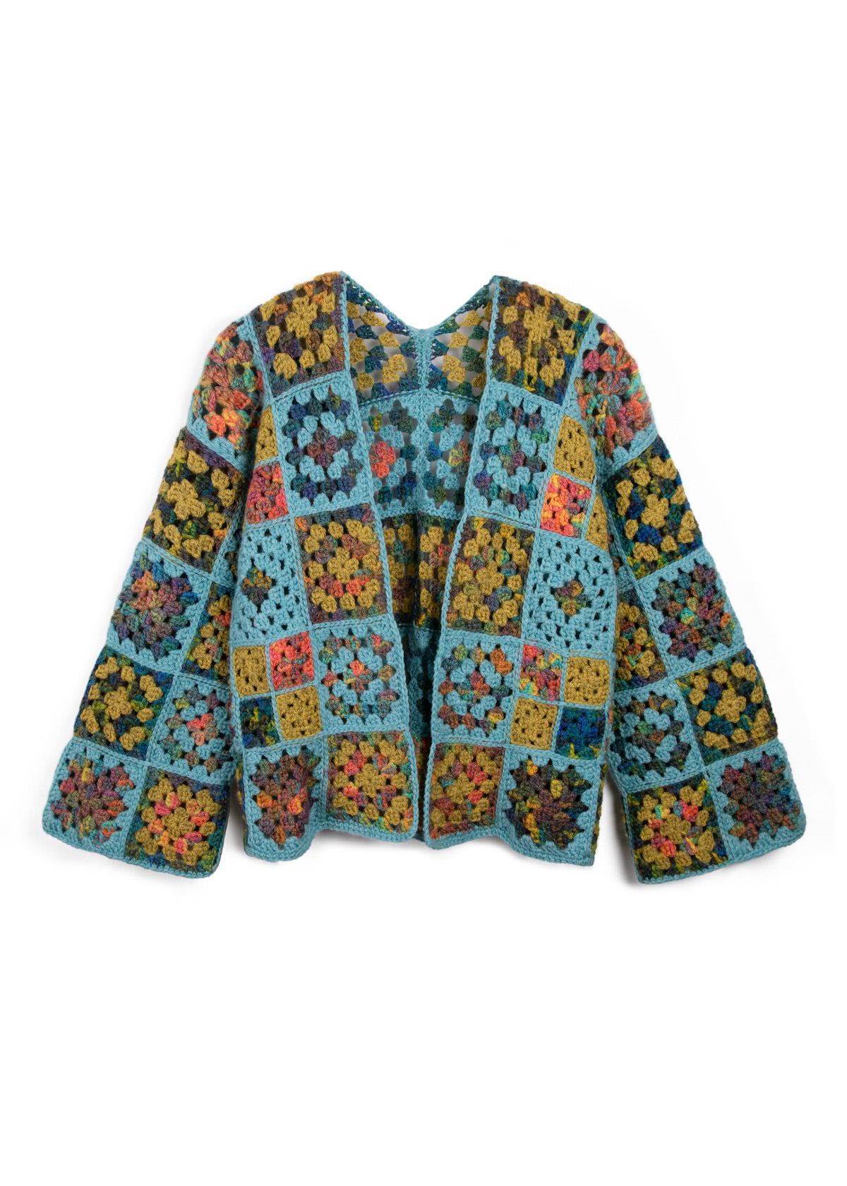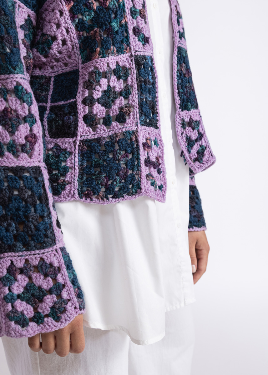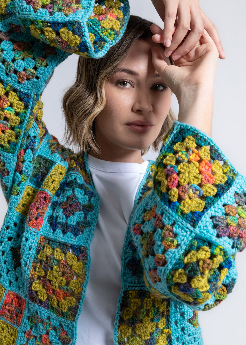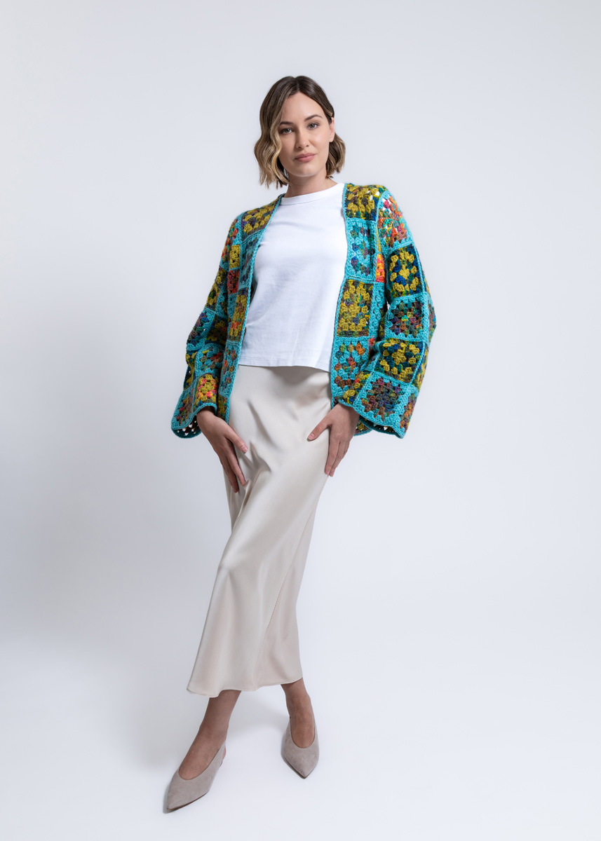 The cardigan has a total length of 55 (55 - 66) cm and a positive ease of 20-12 cm at 80-88 cm bust circumference (26-18 cm at 96-104 cm bust circumference - 28-16 cm at 116-128 cm bust circumference).