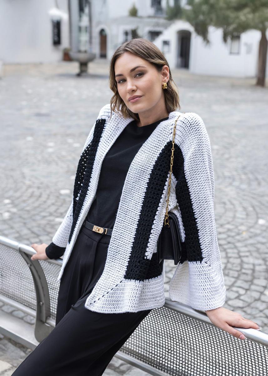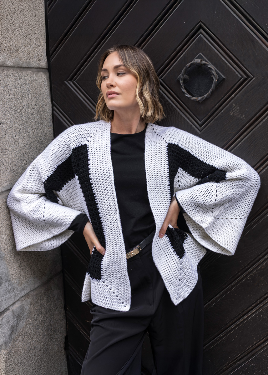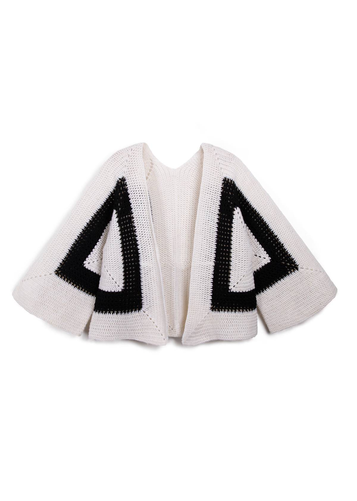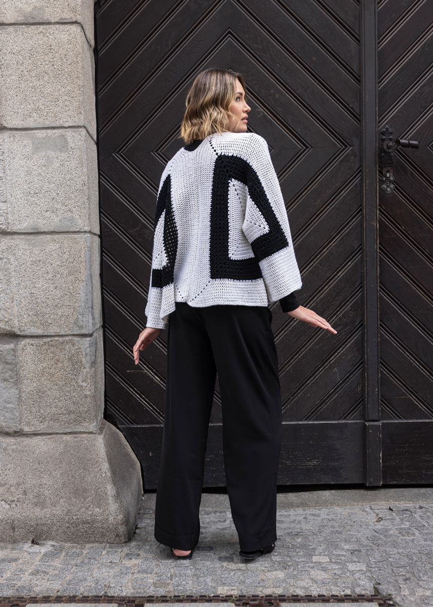 The cardigan is made of 2 hexagons and has a total length of 58 (62 - 67) cm and a positive ease of 36-28 cm at 80 cm bust circumference (36-28 cm at 88 cm bust circumference - 36-24 cm at 96 cm bust circumference).