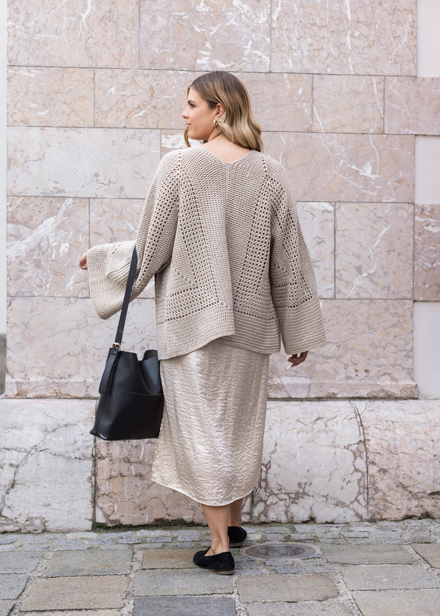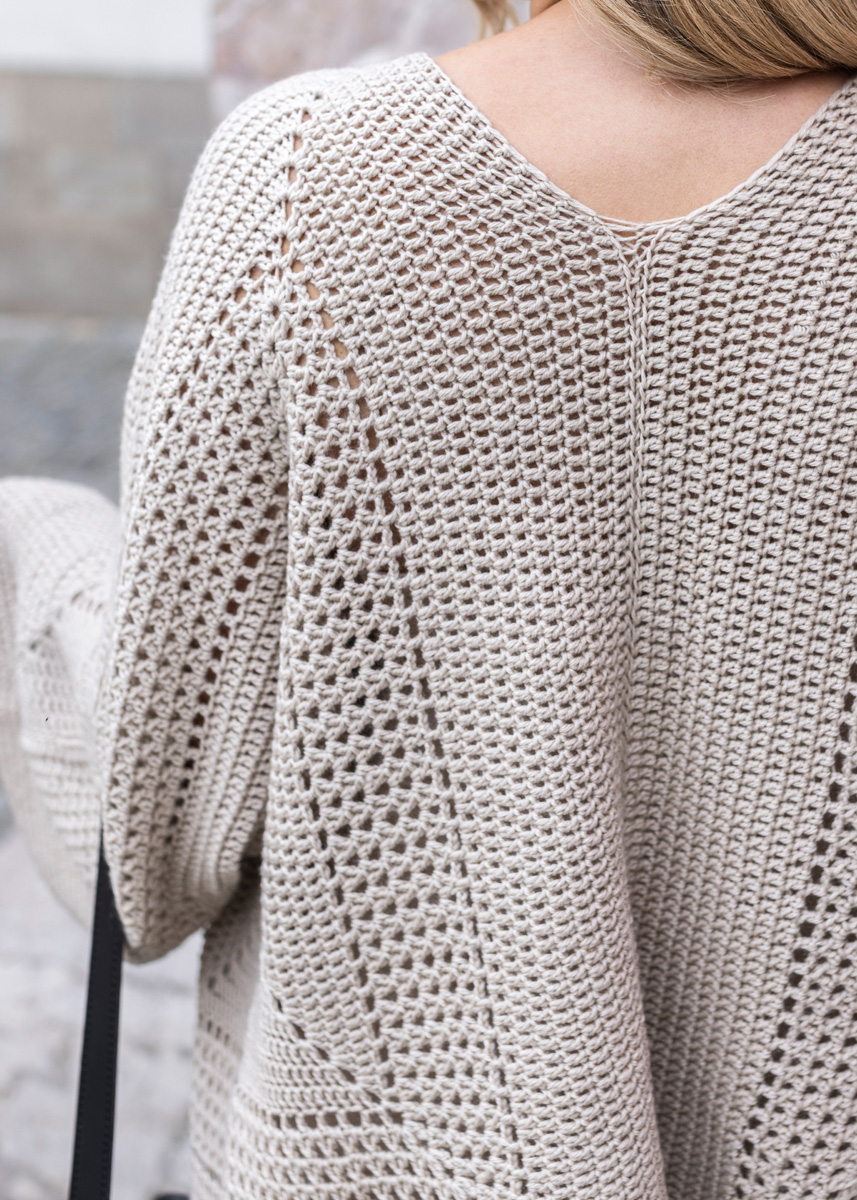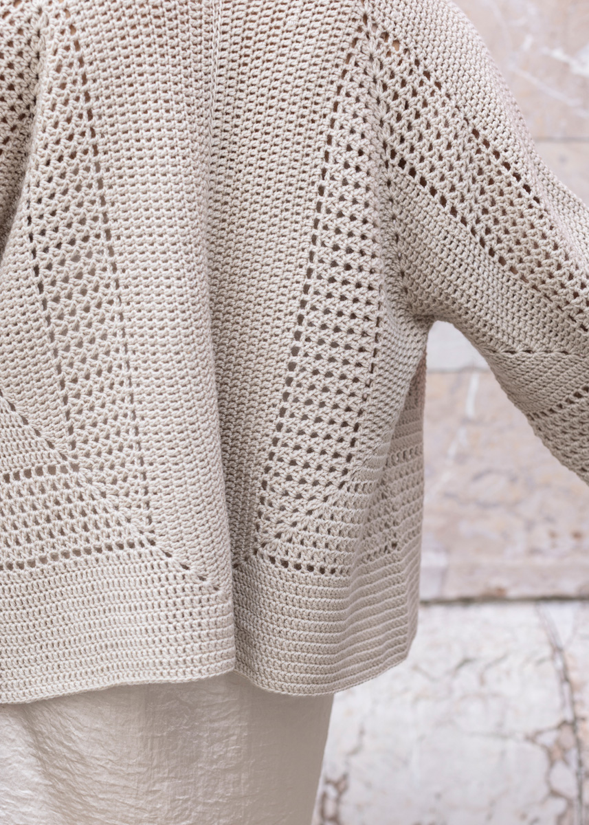 The cardigan is made of 2 hexagons and has a total length of 58 (62 - 67) cm and a positive ease of 36-28 cm at 80 cm bust circumference (36-28 cm at 88 cm bust circumference - 36-24 cm at 96 cm bust circumference).