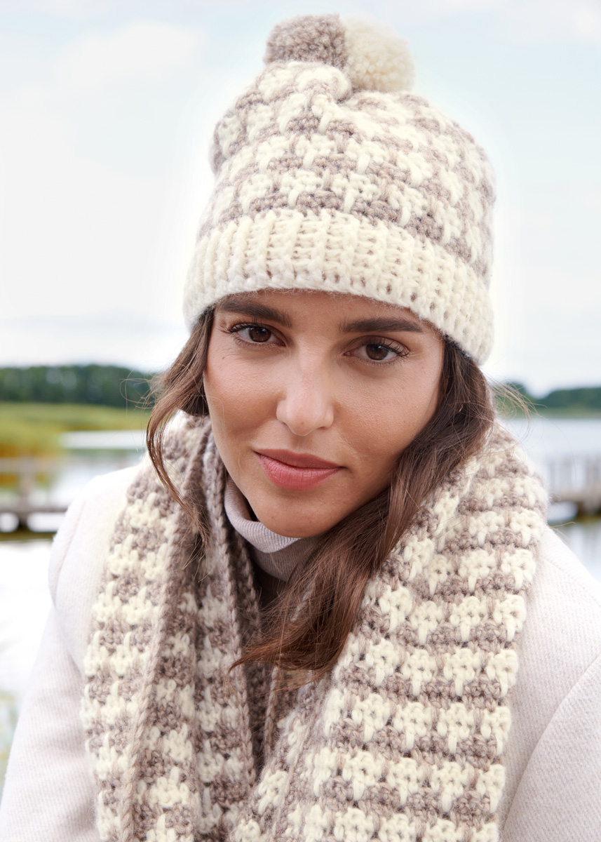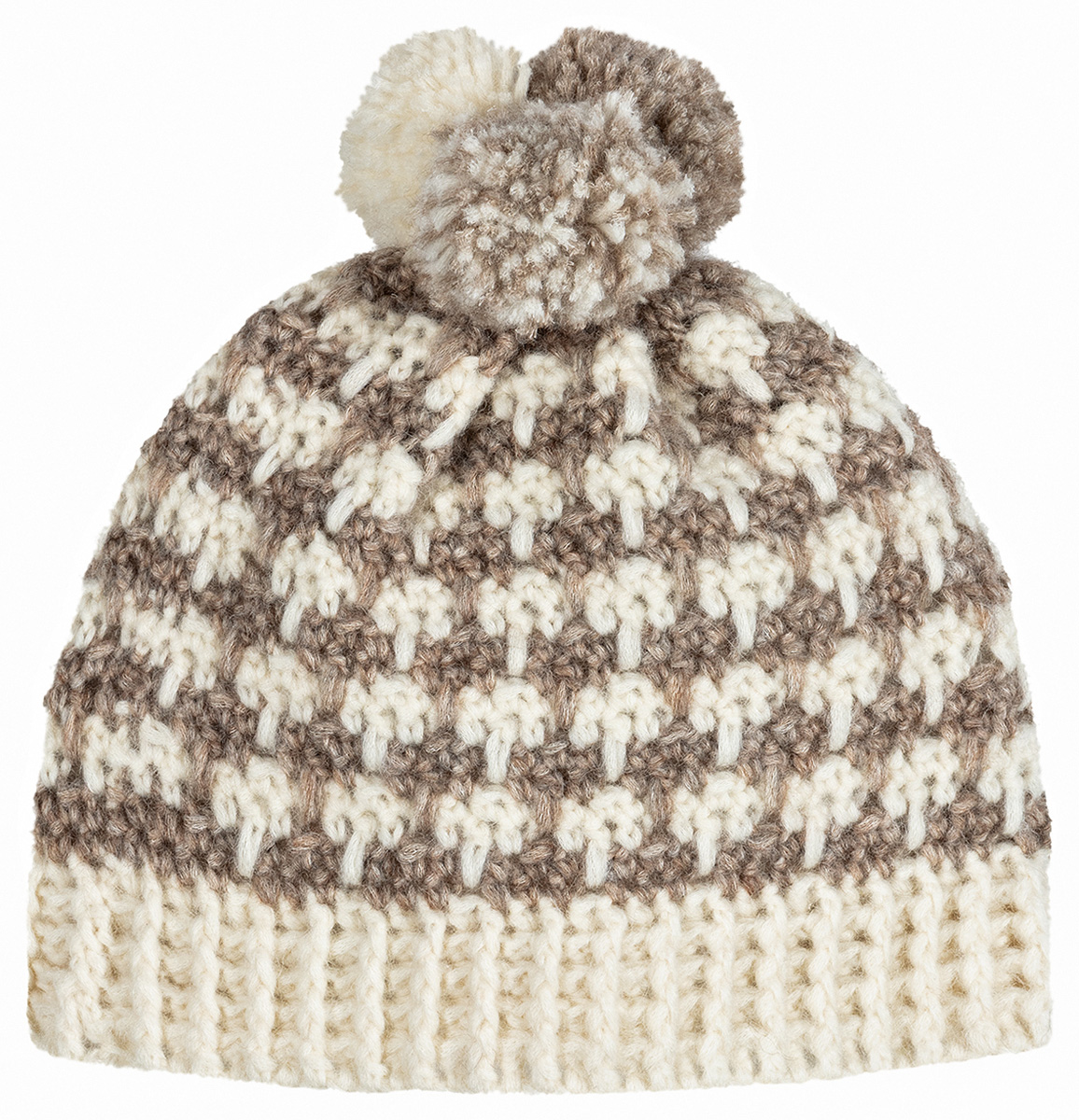 50 g each of Lana Grossa Brigitte No. 2 (47% baby alpaca, 45% cotton, 8% Merino wool; 140 m/50 g) in Off White (col 16) and Beige (col 15). Size 4 and 6 mm crochet hook; pompom maker
