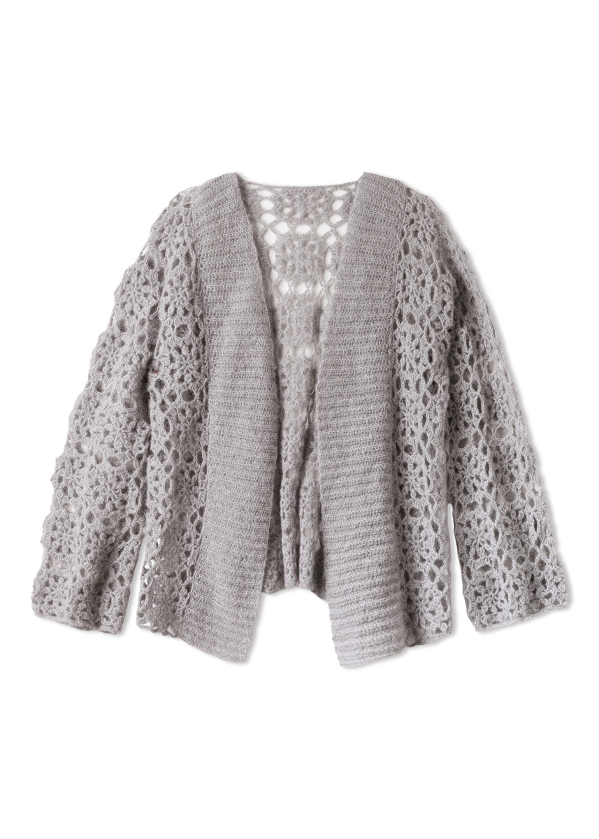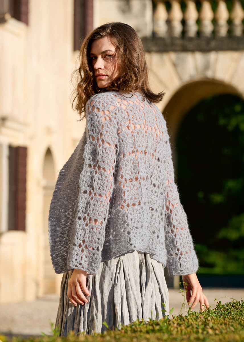 175 (275) g of Lana Grossa Setasuri (69% Suri alpaca, 31% silk; 212 m/25 g) in Light Grey (col 19). Size 3 and 3.5 mm crochet hook.